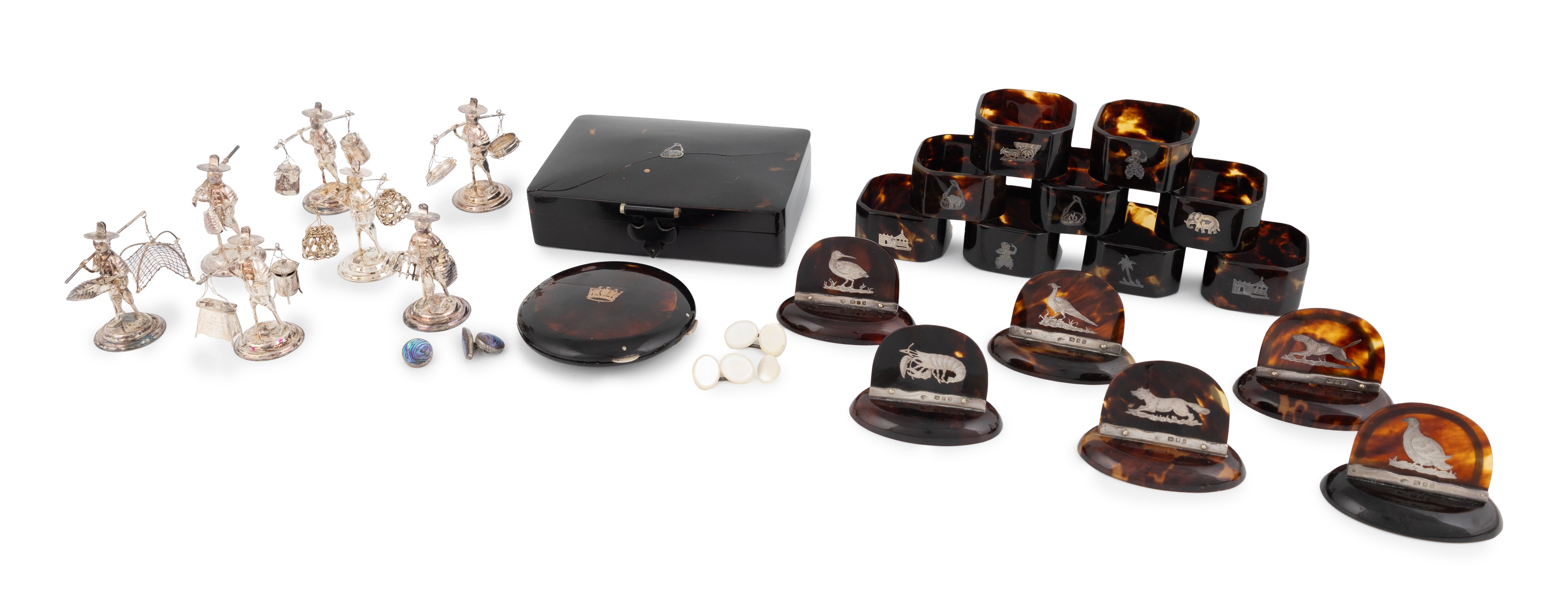 oval form, set with birds, a dog, a fox and a lobster, plus a set of nine silver-mounted tortoiseshell napkin rings, a silver-mounted tortoiseshell box (a.f), a gold-mounted tortoiseshell compact and seven Chinese export silver figures, total approx. weighable 2.6oz. (qty)