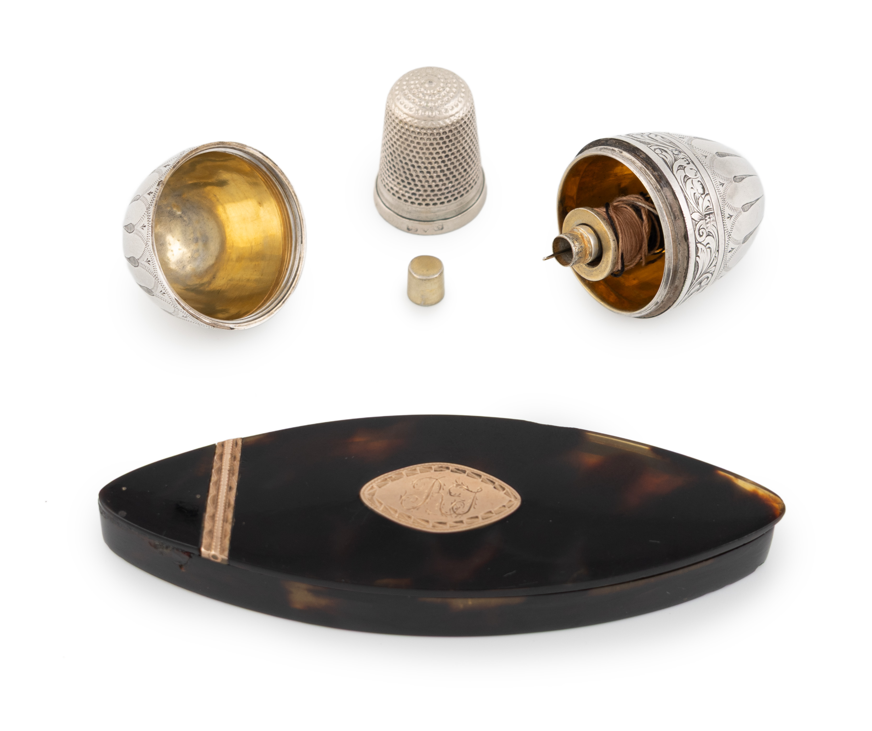 egg form with engraved scroll decoration, screw-off cover with a thimble and cotton reel to the interior with a needle compartment to the base, plus a gold-mounted tortoiseshell toothpick box, length 9.3cm, total approx. weighable 1oz. (2)