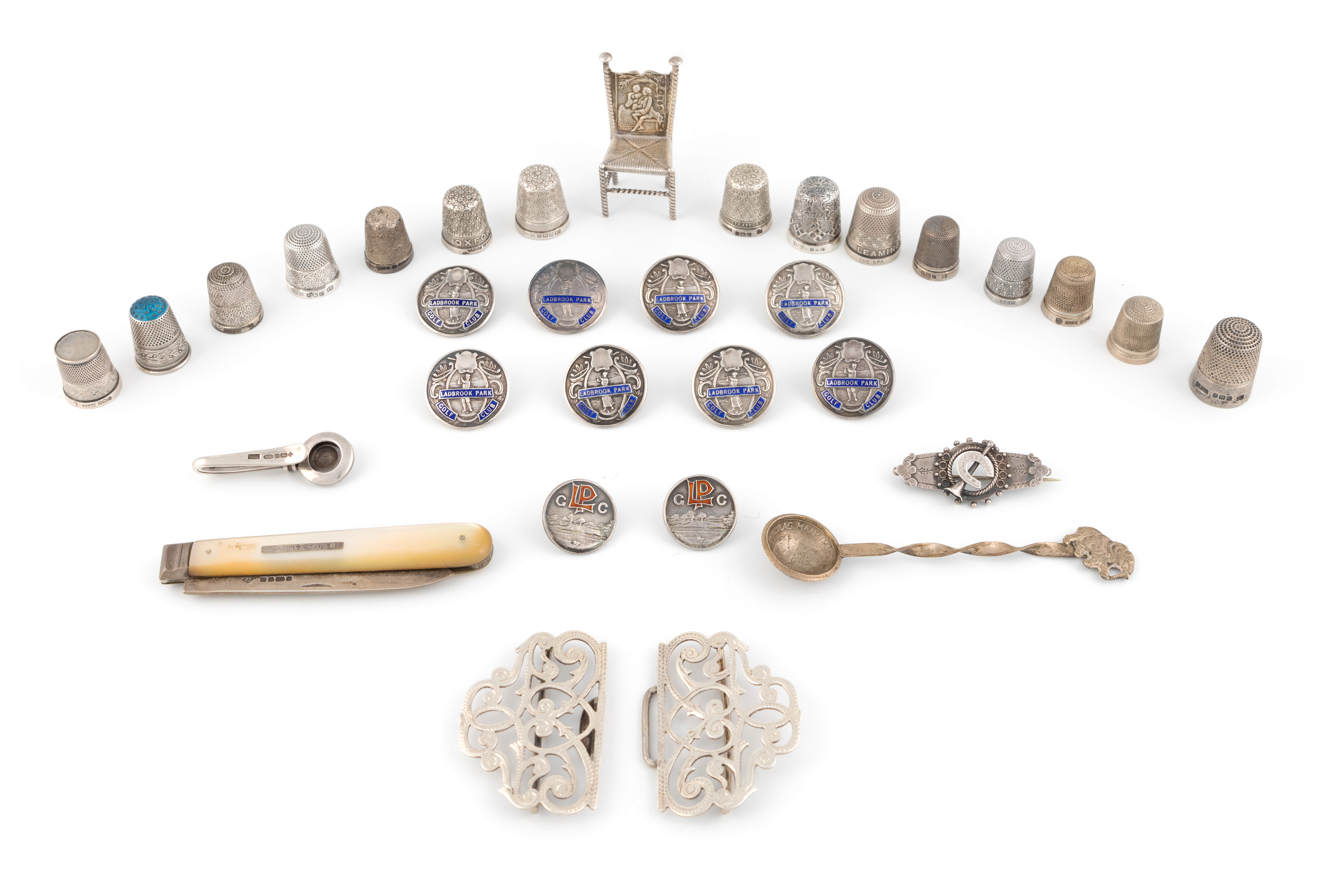 comprising: an Edwardian silver belt buckle by Adie & Lovekin Ltd., Birmingham 1902, fifteen thimbles, a small chair, a napkin clip, a badge, a mother-of-pearl handled fruit knife, a South African coin salt spoon and ten silver and enamel buttons, total approx. weighable 5.3oz. (qty)