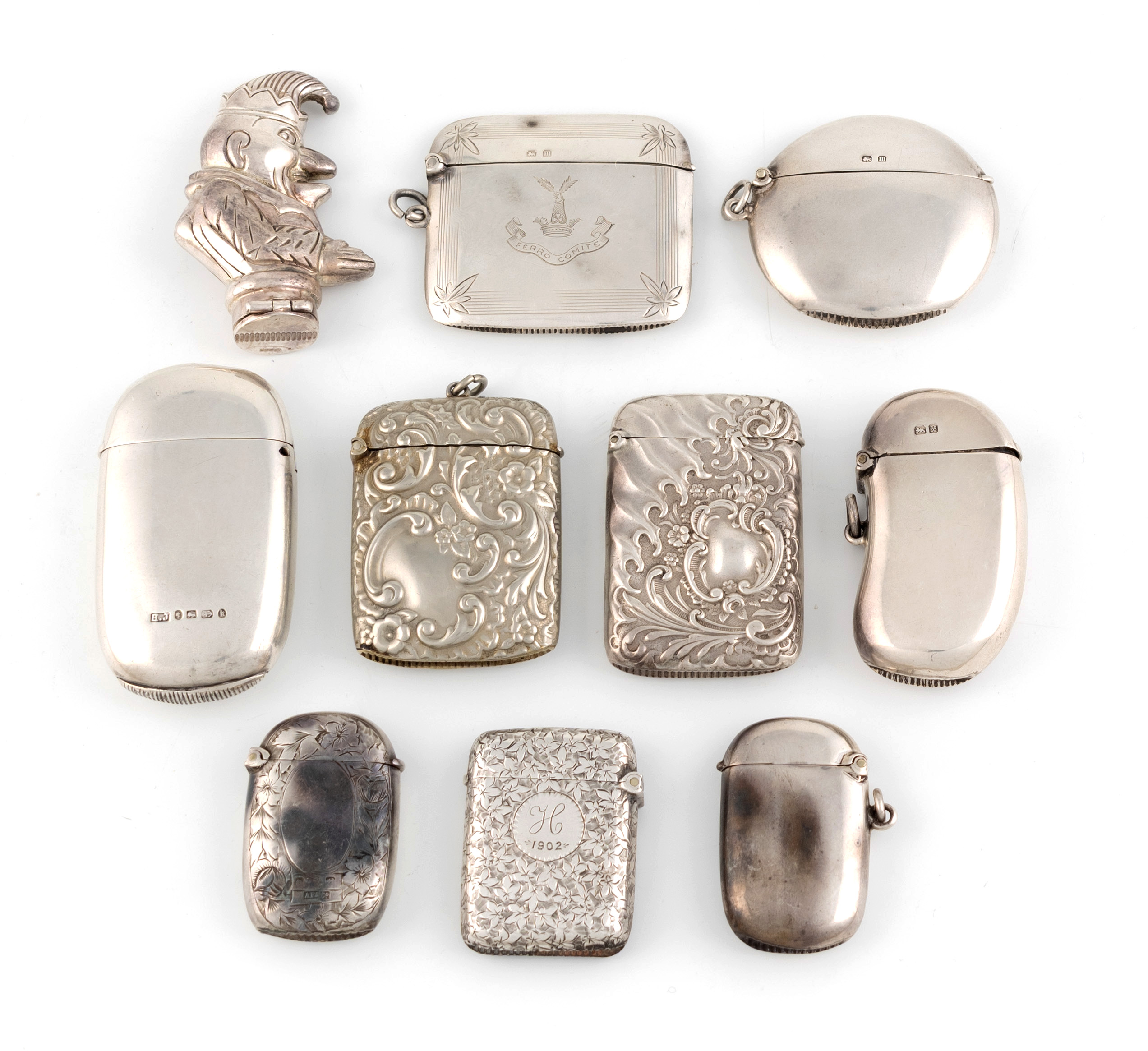 comprising: one by Mappin & Webb, Birmingham 1911, one by Howard James, Birmingham 1884, engraved with a presentation inscription, one by Patterson & Sons Ltd, Birmingham 1911, one by Constantine & Floyd, Birmingham 1894, one by James Deakin & Sons, Chester 1901, a continental one modelled as Mr Punch, plus four other vesta cases, total approx. weight 7.8oz. (10)