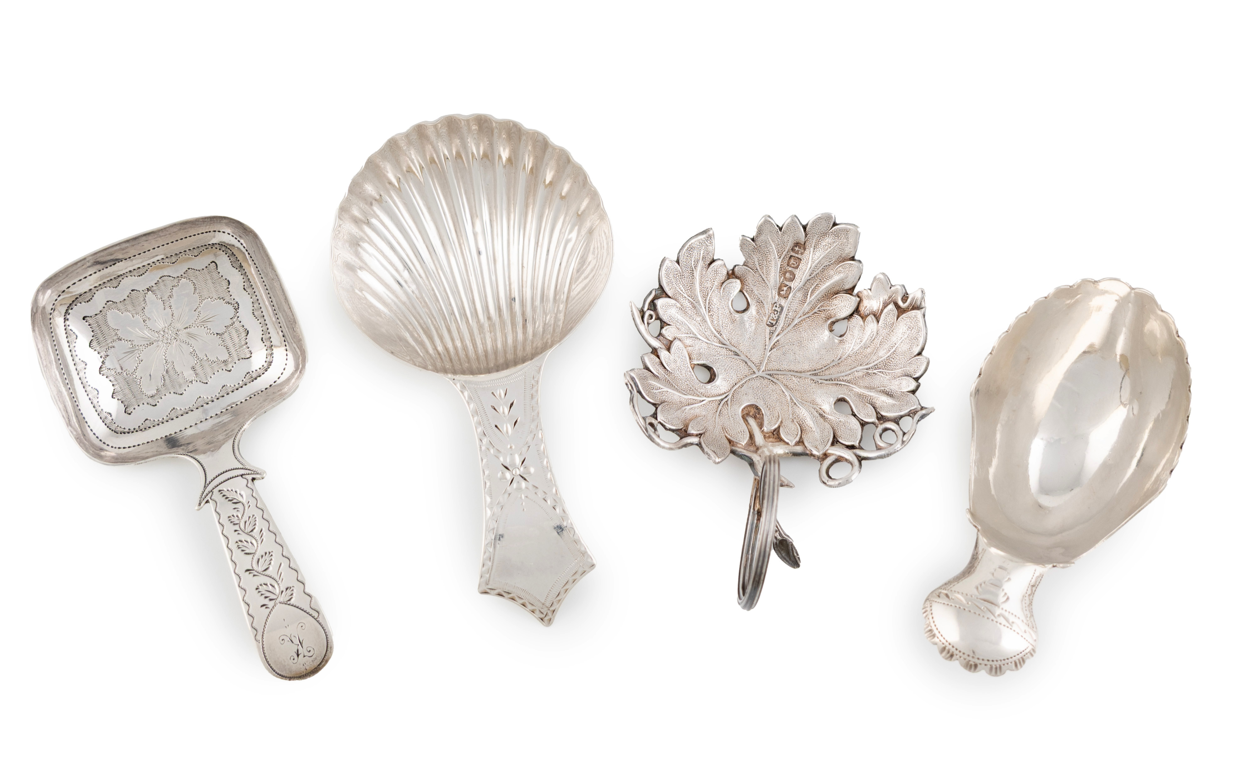 comprising: one by Taylor & Perry, Birmingham 1842, of leaf form with textured decoration, one by Joseph Taylor, Birmingham 1805, oval form with a scalloped edge, one by Cocks & Bettridge, Birmingham 1816, one with rectangular bowl with engraved foliate decoration, and one by Stephen Adams, London 1787, circular form with a fluted bowl, total approx. weight 1.1oz. (4)