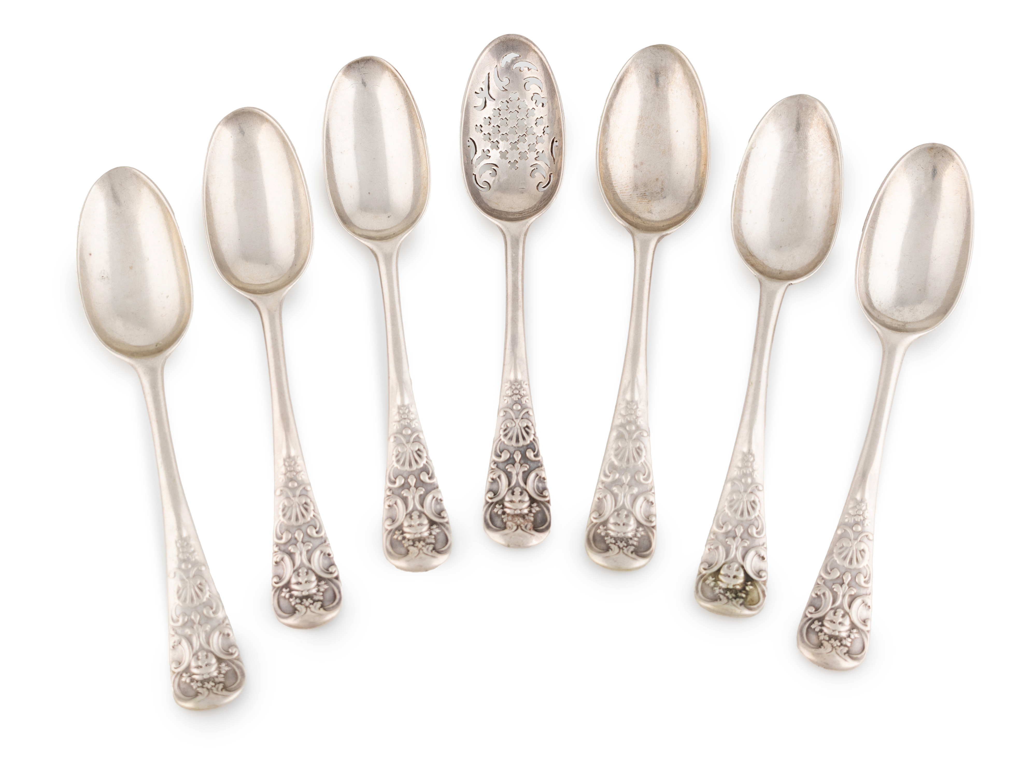 the terminals with shell scroll and mask decoration, the reverse of the bowls with a shell heel, the reverse of the terminal with a crest, approx. weight 3.8oz. (7)