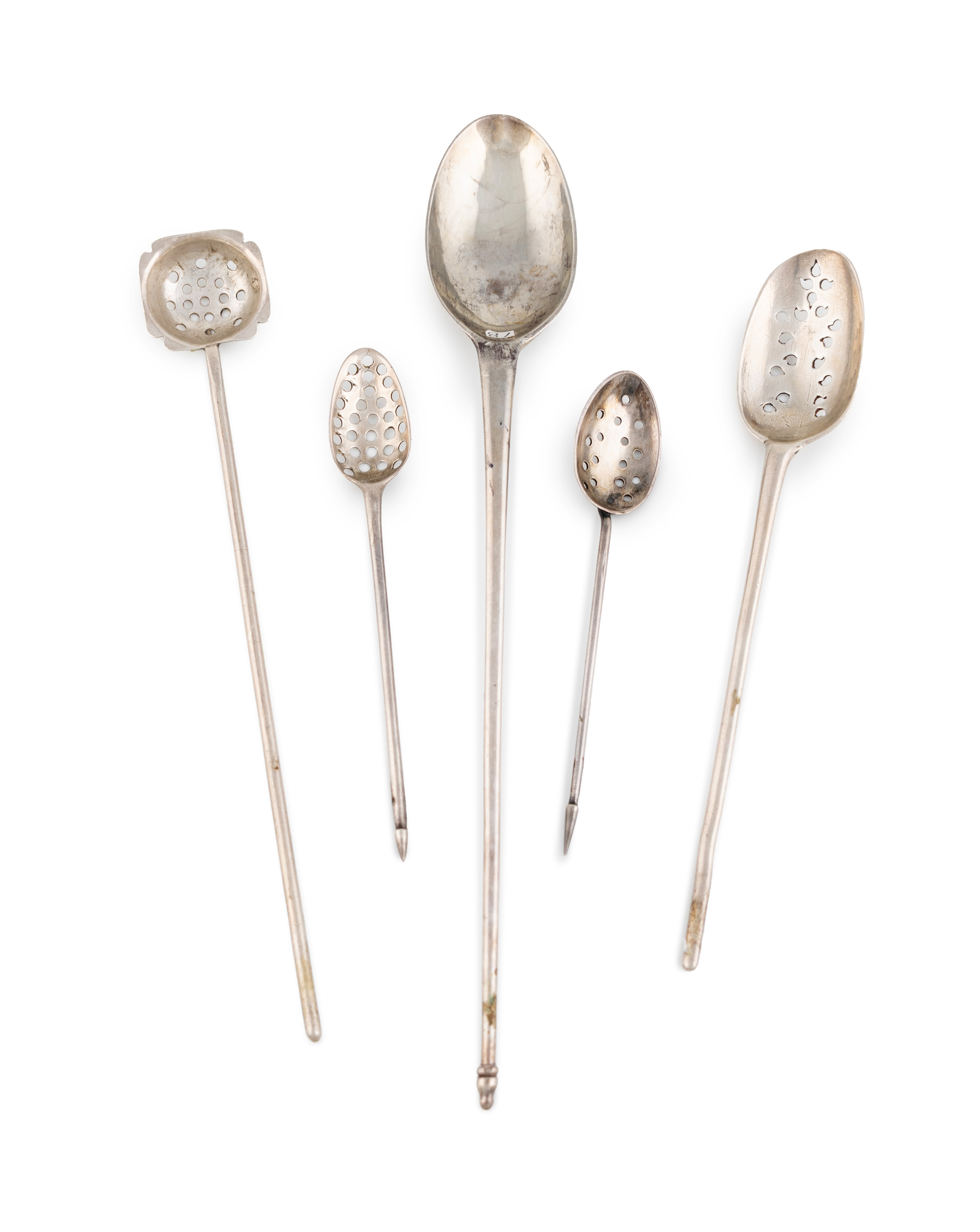 comprising: two early-18th century miniature mote spoons, one with scratch initials, plus a mote spoon with a square bowl, plain piercing and a Scottish masking spoon, maker's mark GC, possibly for George Cooper of Aberdeen, approx. total weight 1.1oz. (5)