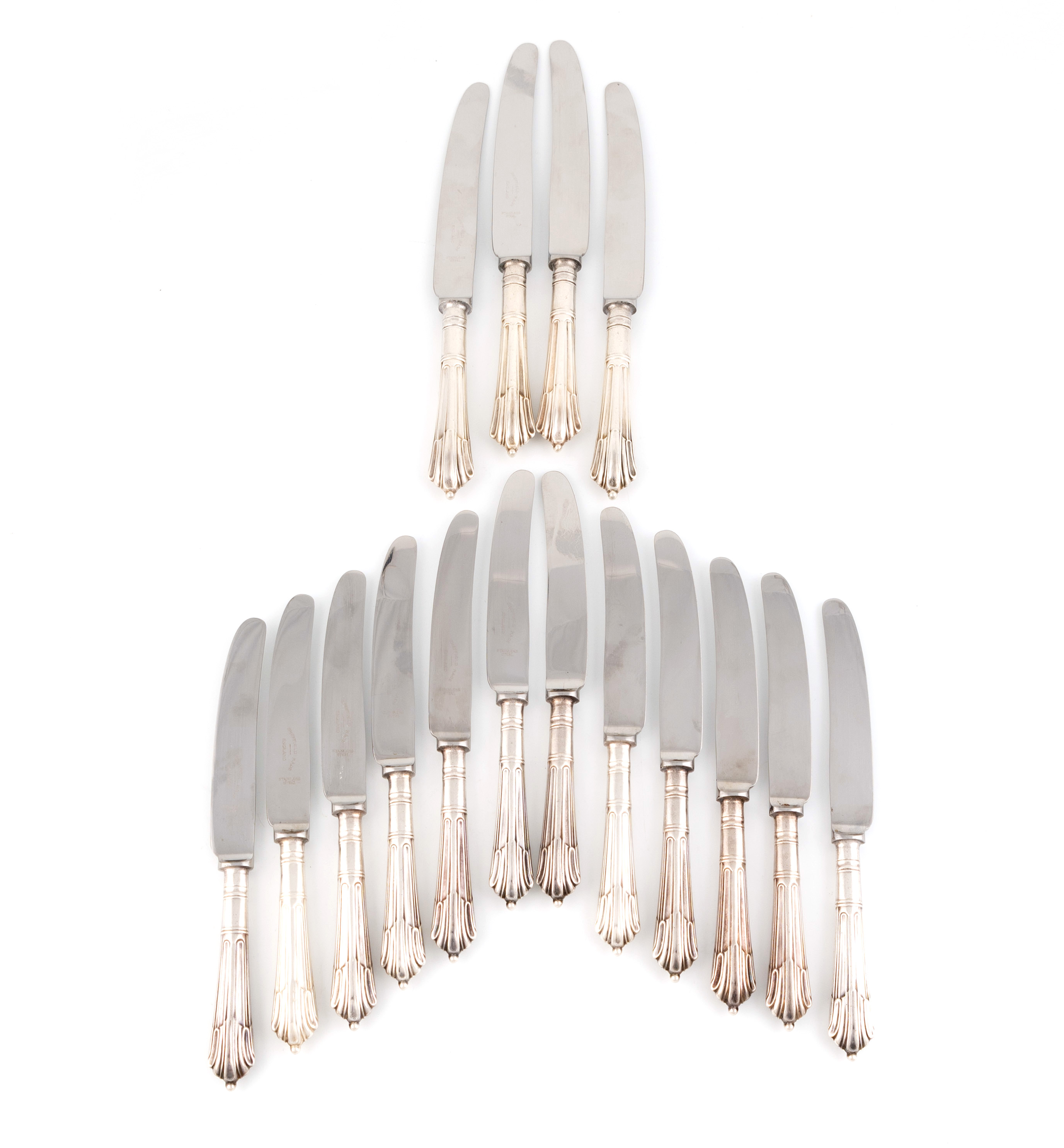 A set of twelve electroplated Albany pattern dessert knives, unmarked, with four Albany pattern