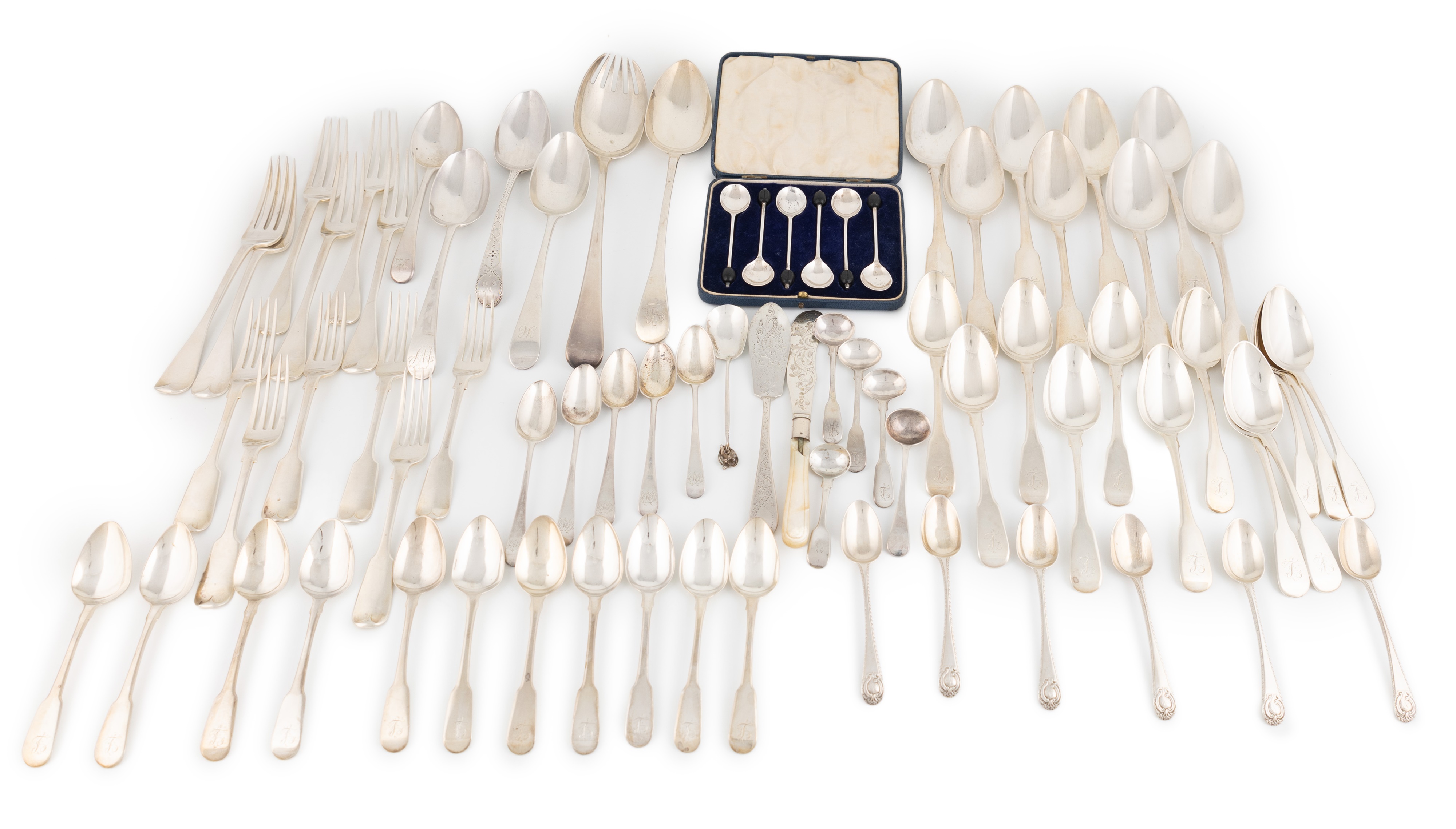 comprising: six table forks, six dessert forks, eleven tablespoons, thirteen dessert spoons, twenty-two teaspoons, five salt spoons, a salad server, a basting spoon, a butter knife, a mother-of-pearl handled fish knife, a condiment spoon and a cased set of six coffee spoons, total approx. weighable 76oz. (qty)