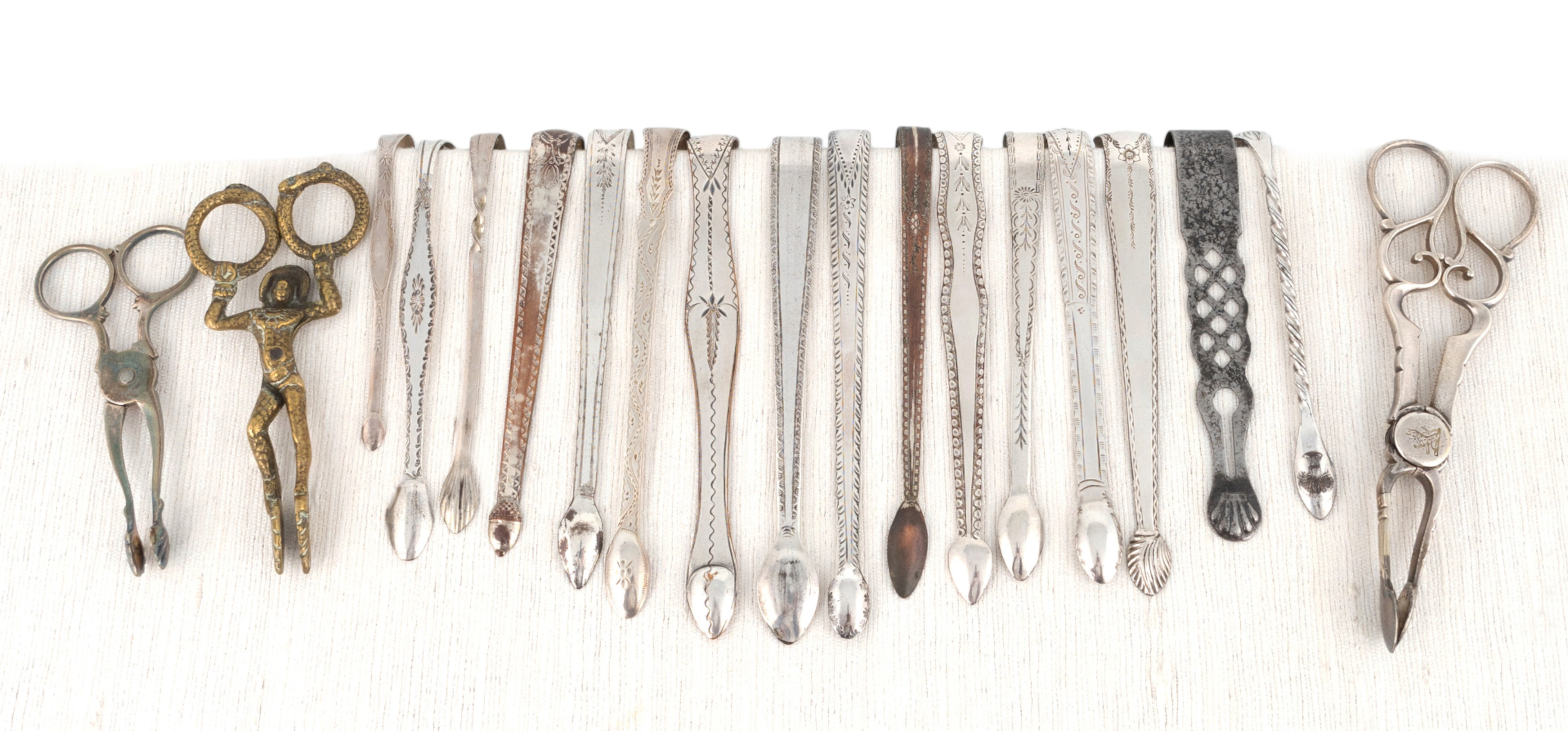 A large collection of old Sheffield plated, electroplated and base metal sugar tongs,