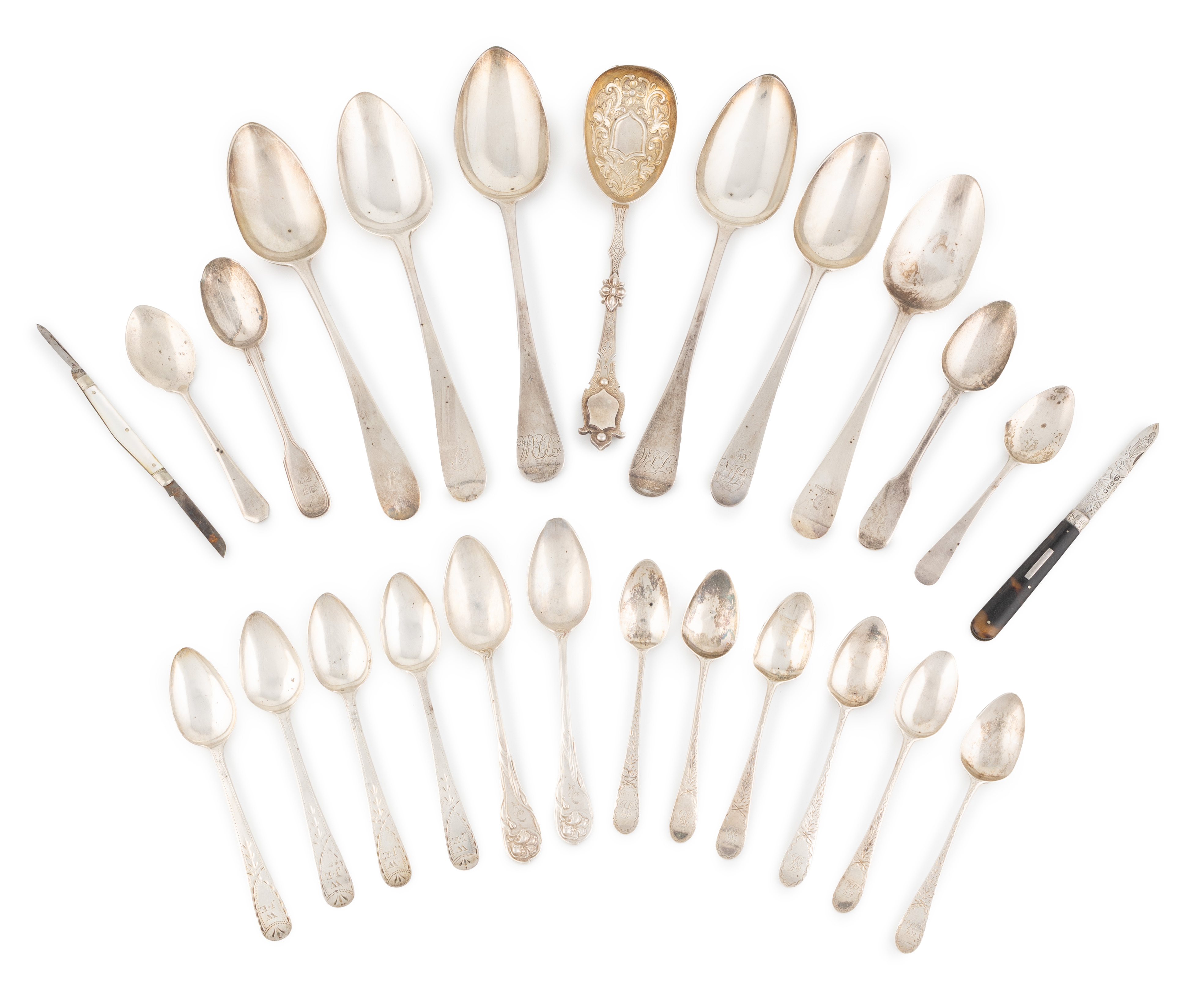 comprising: a set of four George III silver teaspoons by Thomas Watson, Newcastle circa 1810, a George III silver tablespoon by Hester Bateman, London 1783, plus twelve other teaspoons, five tablespoons, a serving spoon, a tortoiseshell handled folding fruit knife and a mother-of-pearl handled folding knife, total approx. weighable 21.7oz. (qty)