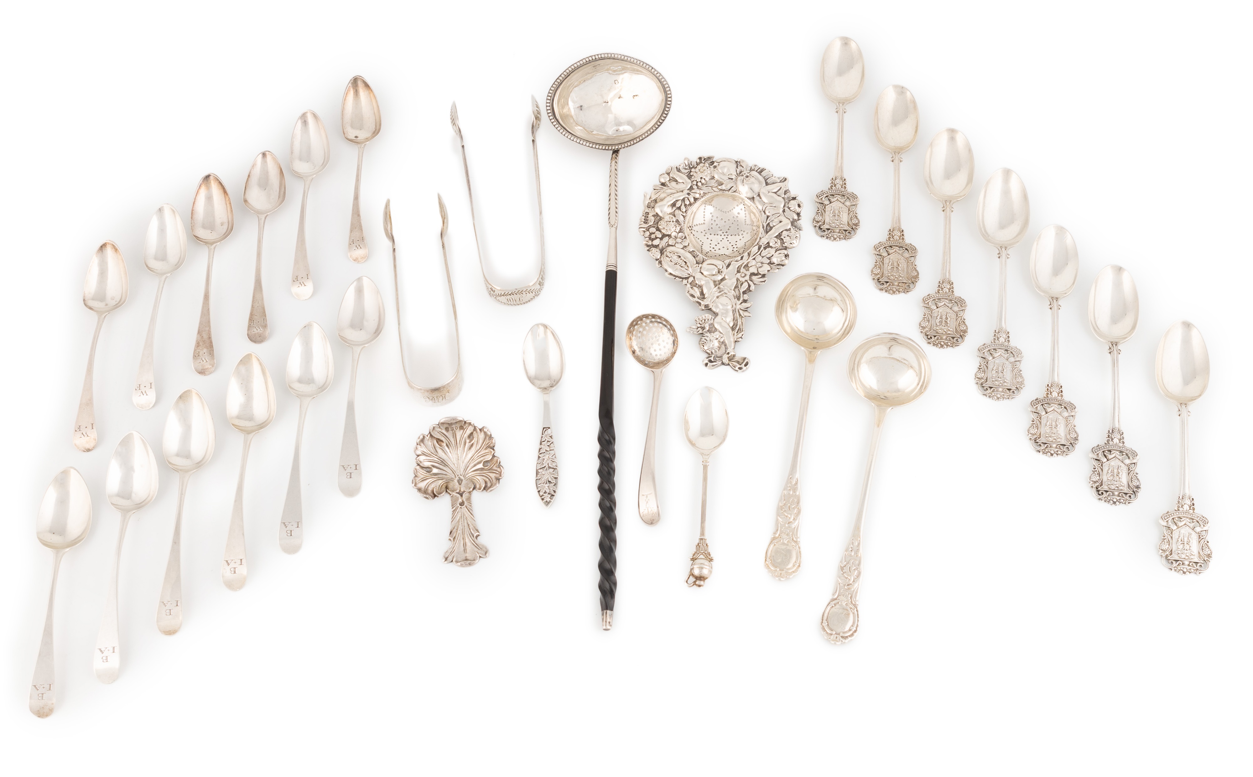 comprising: a set of six armorial teaspoons by Elkington & Co Ltd, Birmingham 1912, plus another similar, a Victorian silver caddy spoon by John Tongue, Birmingham 1839, of leaf form, plus fourteen other teaspoons, two pairs of sugar tongs, a pair of sauce ladles, a sugar sifter, a tea strainer and a toddy ladle, total approx. weighable 22.9oz. (qty)