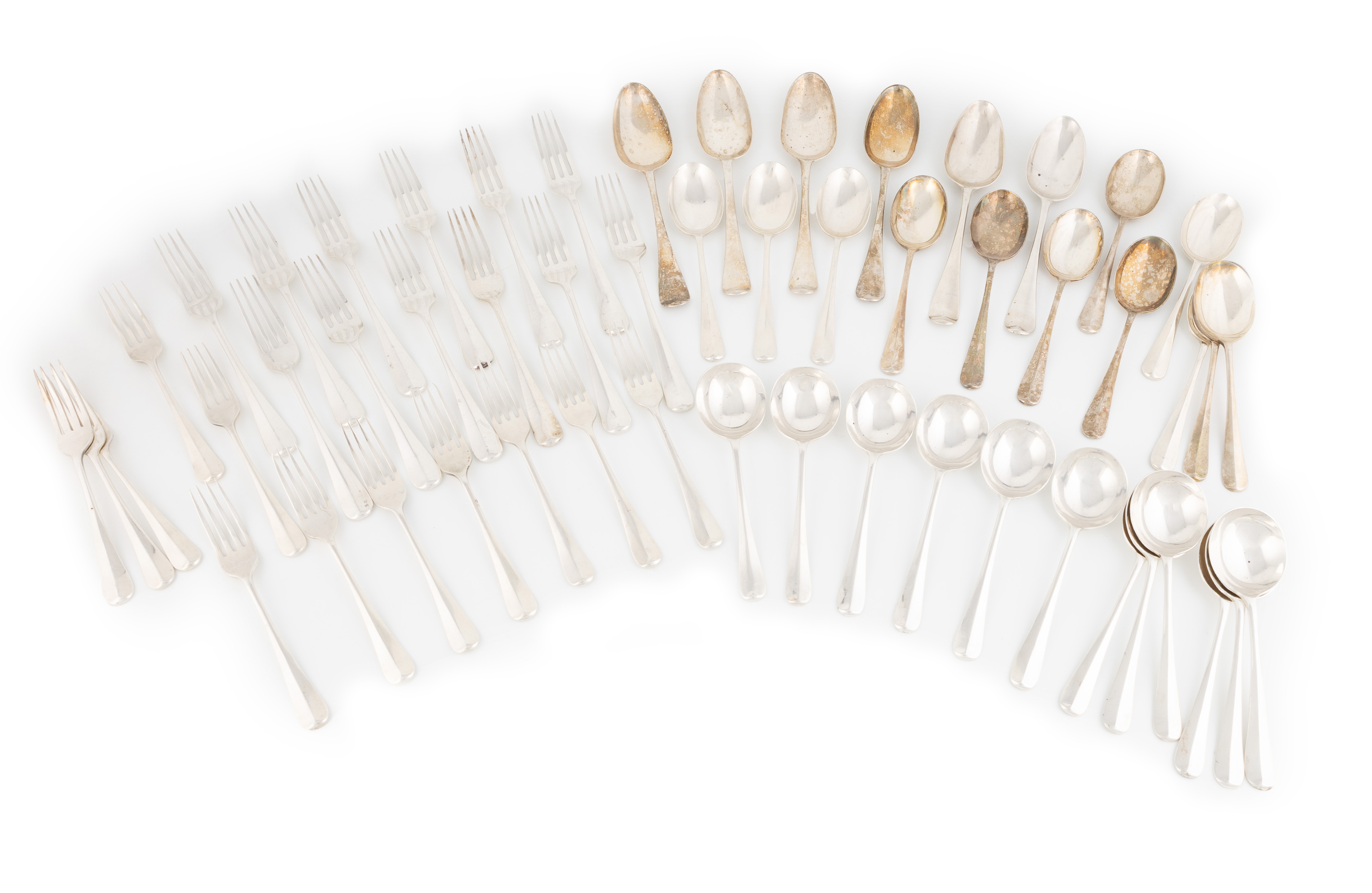 comprising: twelve table forks, twelve dessert forks, twelve soup spoons, twelve dessert spoons, plus a matched set of six Hanoverian tablespoons, total approx. weight 101.8oz. (qty)