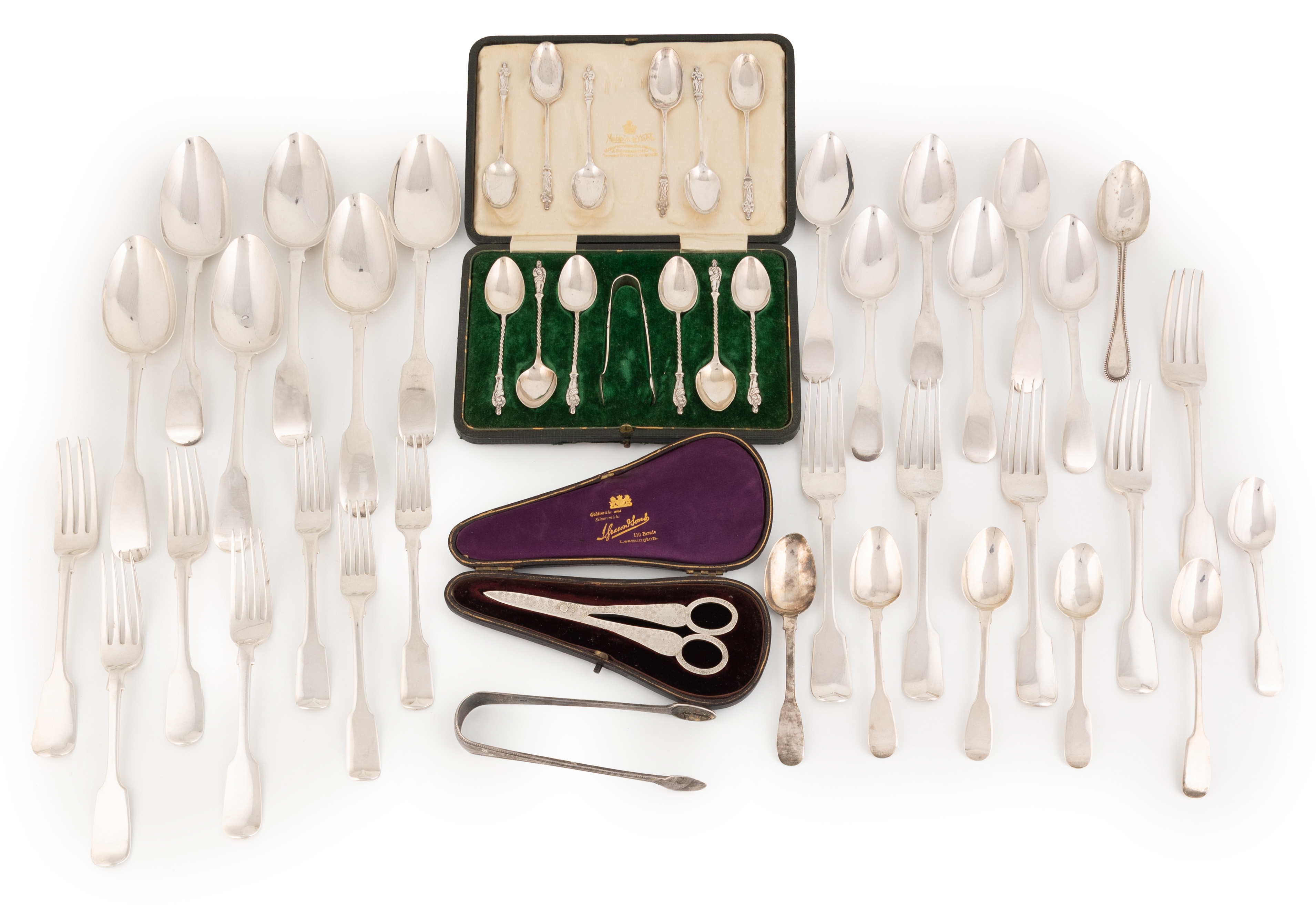 comprising: a cased pair of late-Victorian silver scissors by Wakely & Wheeler, London 1896, six table forks, six dessert forks, six tablespoons, six dessert spoons, thirteen teaspoons, a pair of sugar tongs and a cased set of six teaspoons and sugar tongs, total approx. weight 53.1oz. (qty)