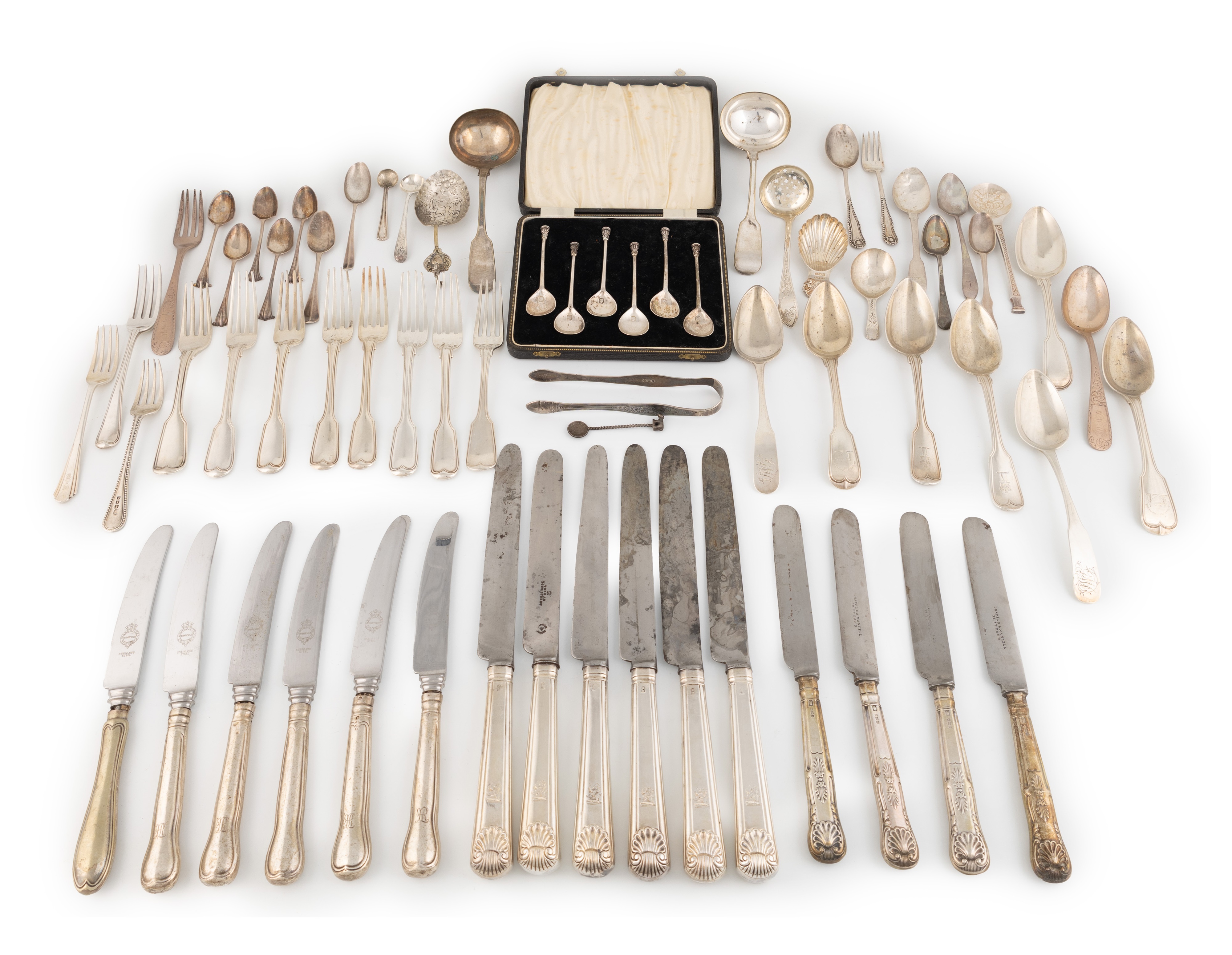 A mixed lot of flatware, comprising: a set of six William IV silver Fiddle and Thread pattern
