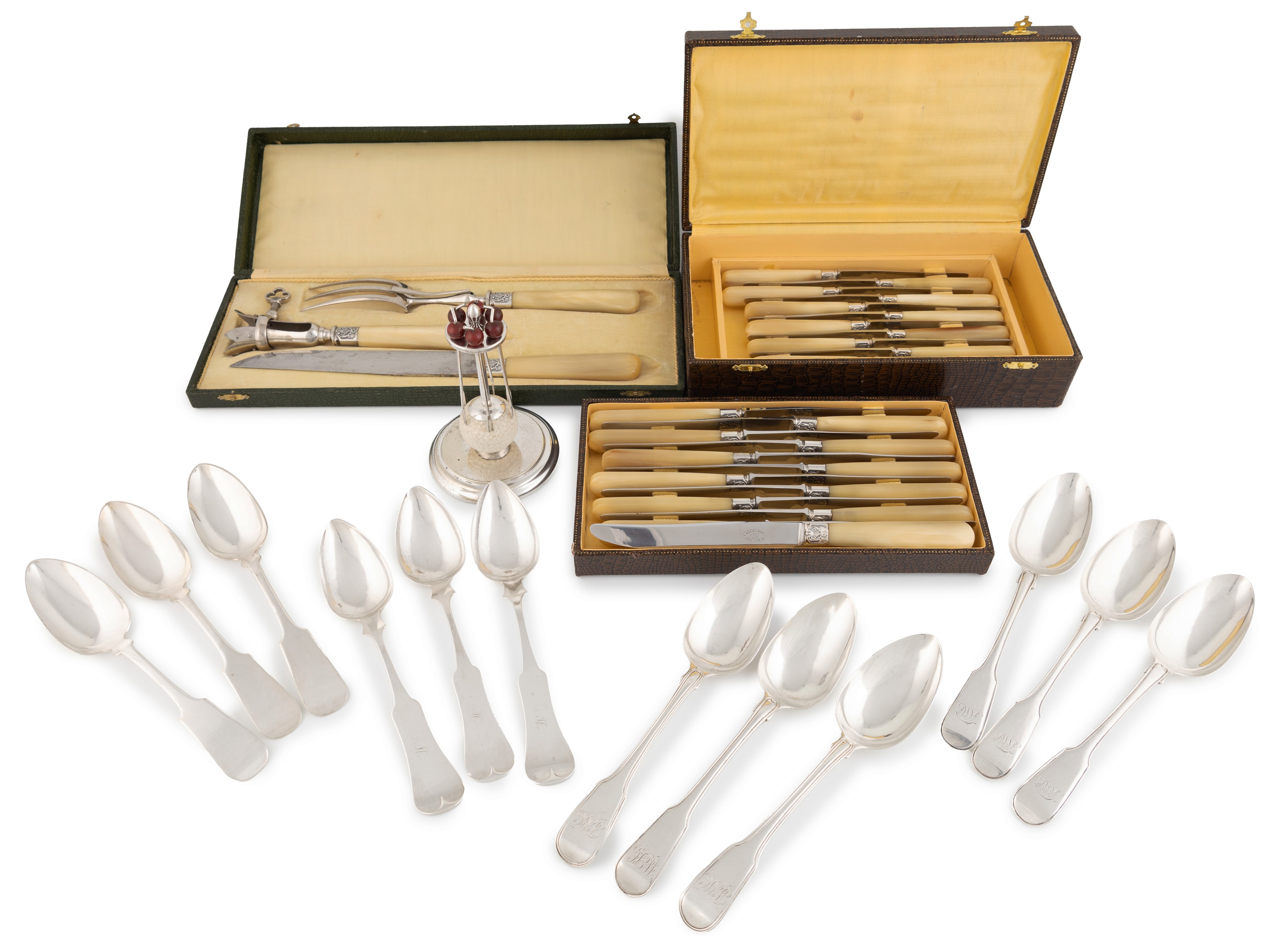 comprising: three American silver tablespoons by F & D Kinsey, Cincinnati circa 1850, a matched set of six Fiddle and Thread tablespoons, plus three American silver-plated tablespoons, a cased carving set, a cased set of twelve table and dessert knives, and a novelty golf cocktail stick stand, total approx. weighable 18.4oz. (qty)