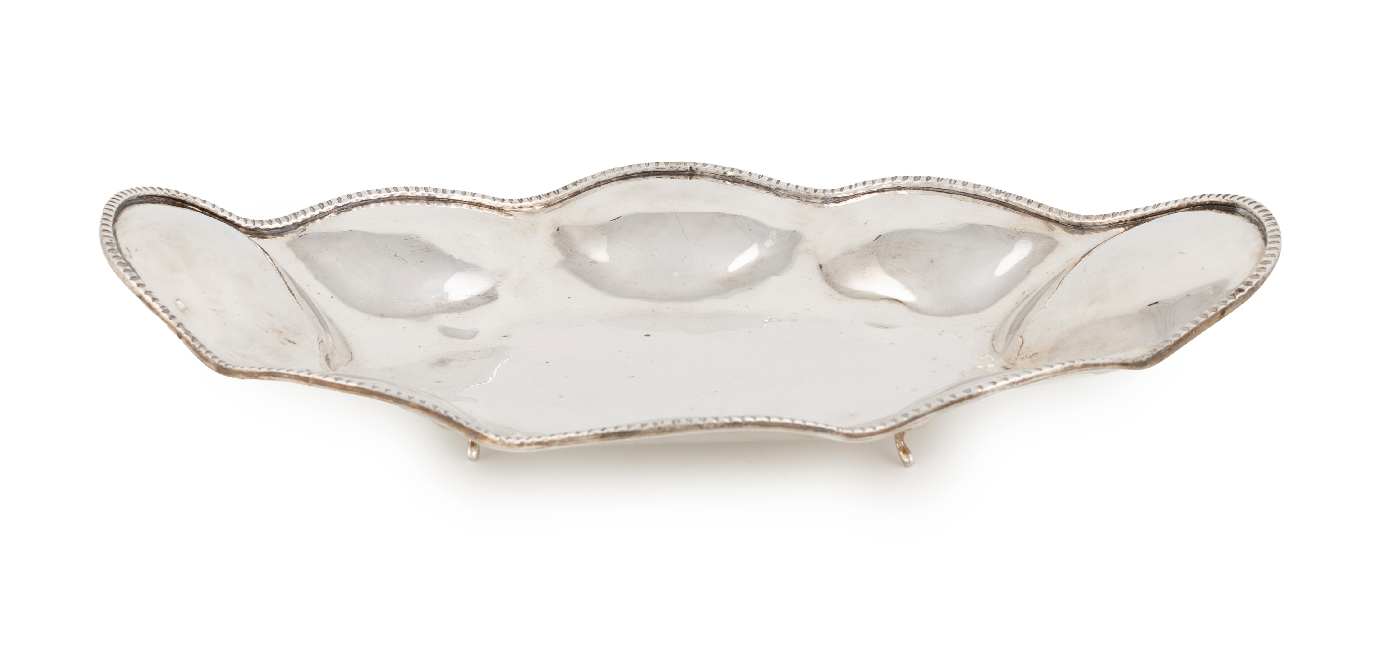 oval lobed form with a fluted border, on four pad feet, length 41.8cm, approx. weight 21.9oz.
