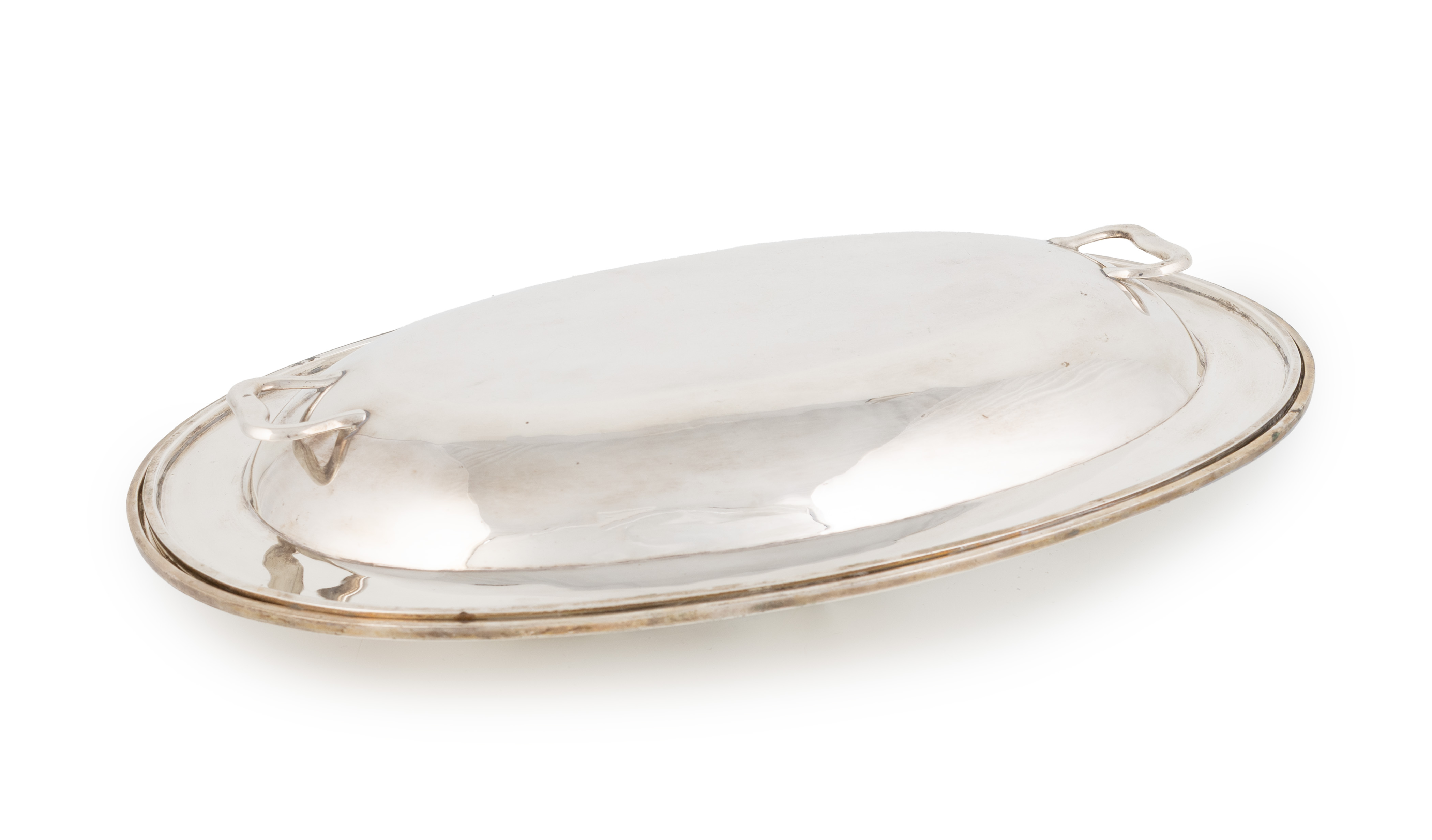 plain oval form, with a central divider, the cover with two ring handles, length 37.3cm, approx. weight 57.1oz.