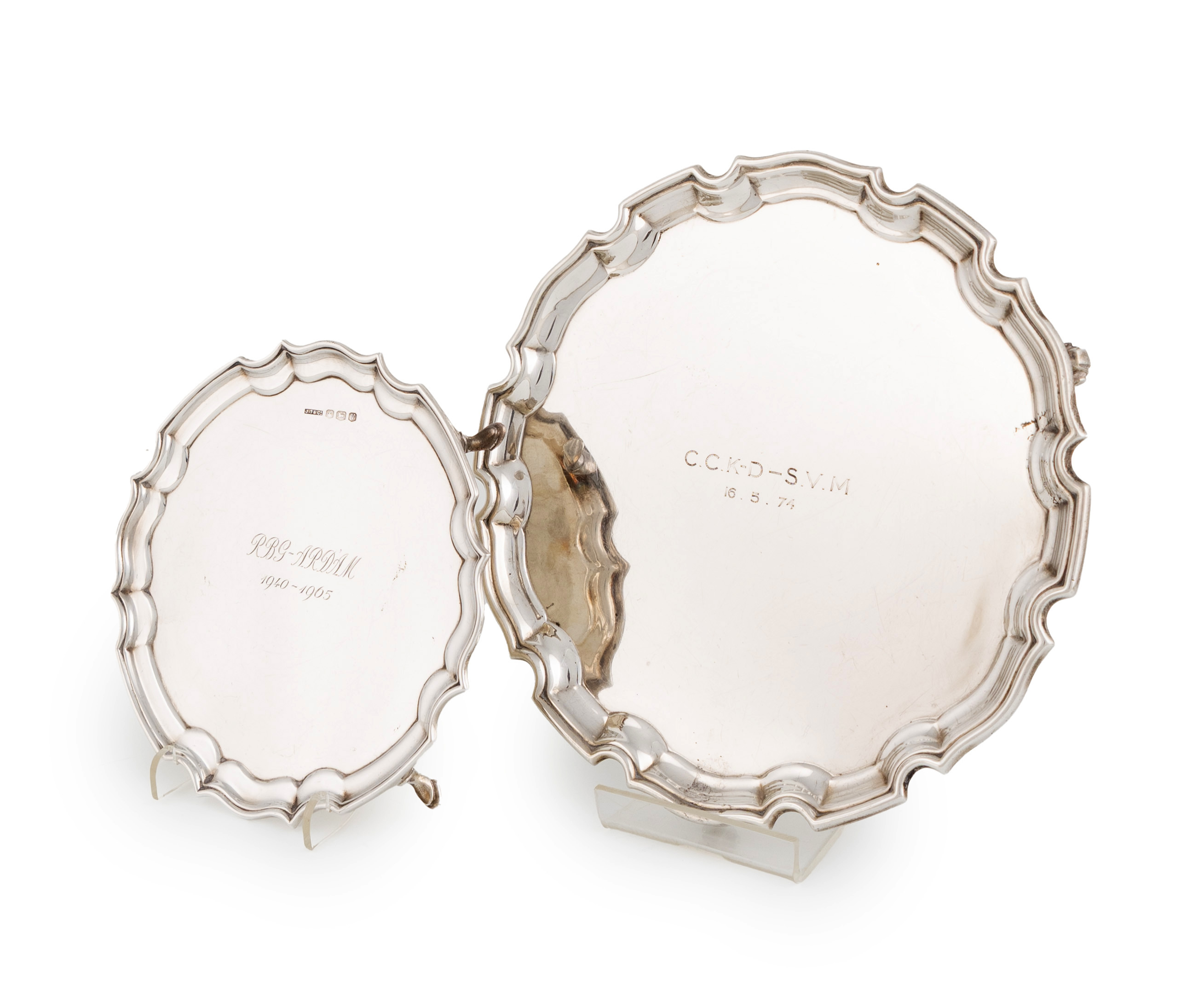 shaped circular form, moulded border, engraved 'C.C.K-D - S.V.M 16.5.74', on three scroll feet, diameter 20.8cm, plus a silver waiter by John Turton & Co., Sheffield 1963, total approx. weight 18.5oz. (2)
