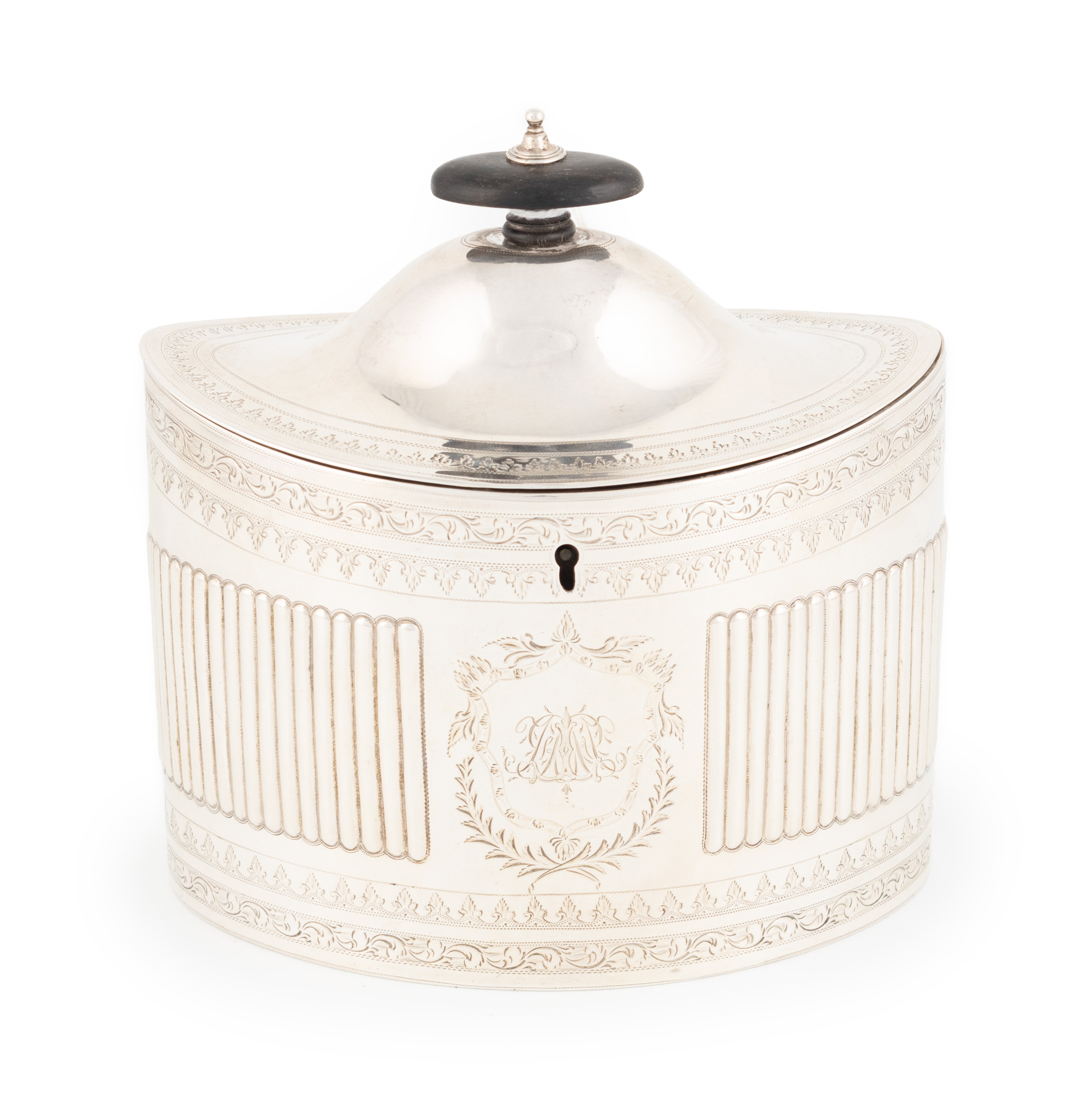 A George III silver caddy,by Robert Hennell, London 1795,oval form, engraved foliate decoration, a
