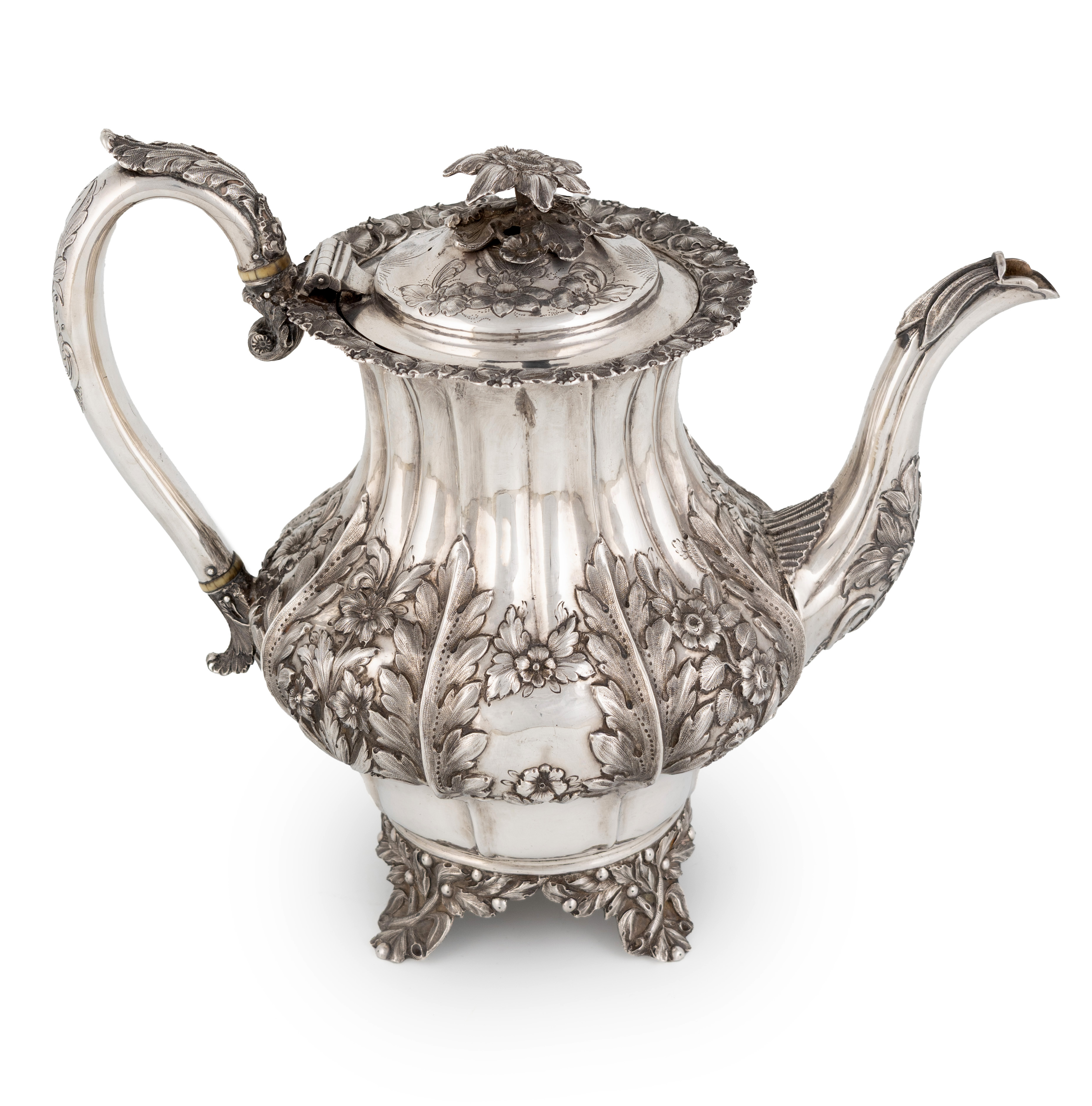 λ A William IV silver coffee pot,by Atkins & Somersall, London 1836, lobed baluster form with a