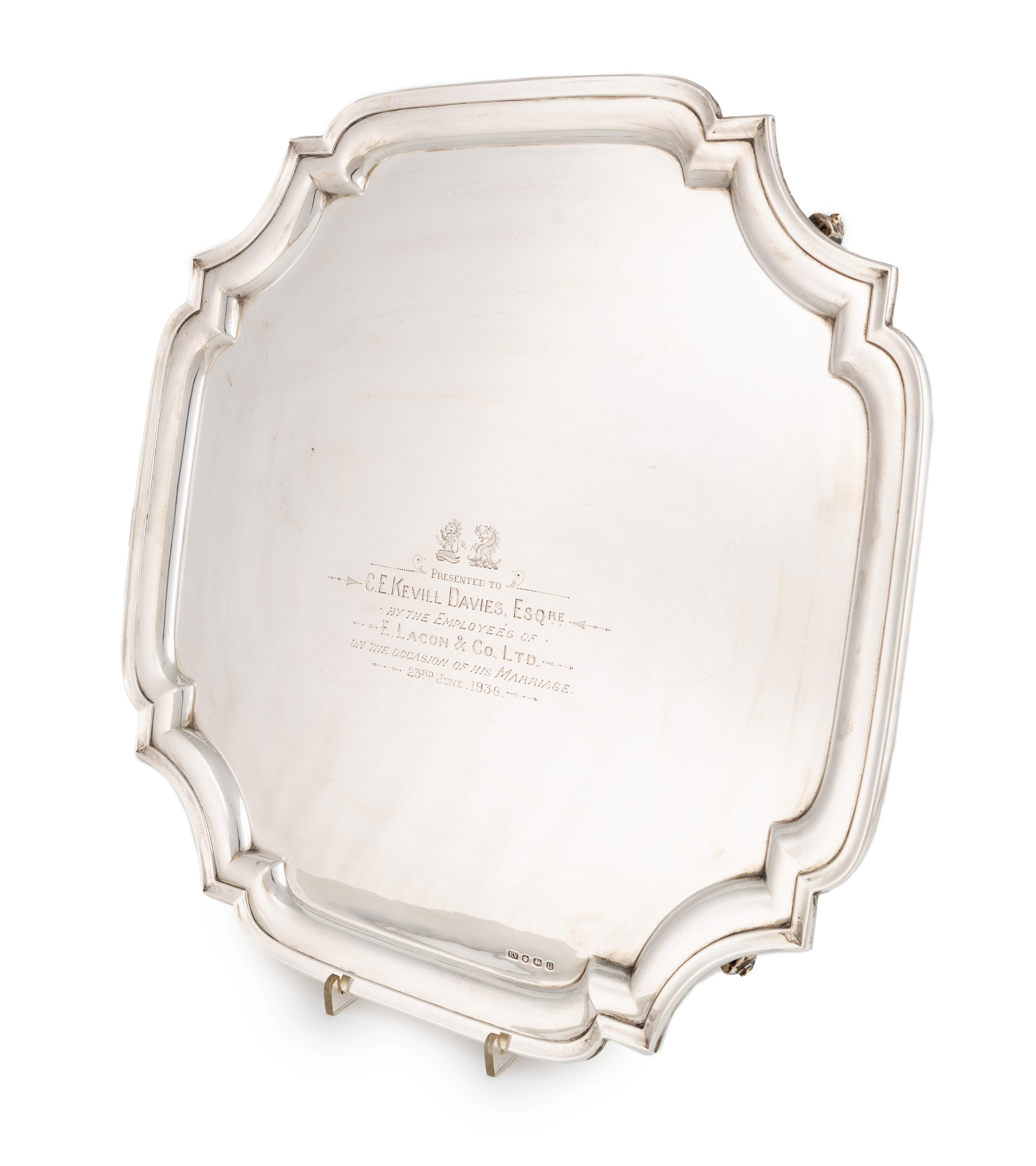 square form with canted corners, moulded border, two central engraved crests and inscription 'Presented to C.E Kevin Davies, Esqre. By the Employees of E.Lacon & Co., Ltd on the occasion of his marriage . 23rd June 1938', on four gnarl feet, length 42cm, approx. weight 58.2oz.
