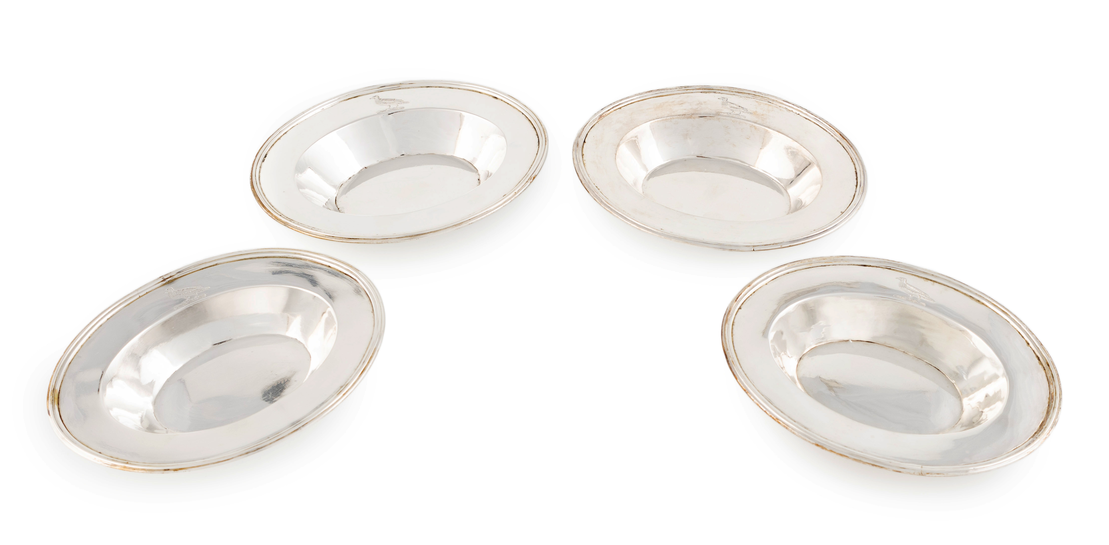 plain oval form with an engraved crest, length 12.3cm, total approx. weight 8.9oz. (4)
