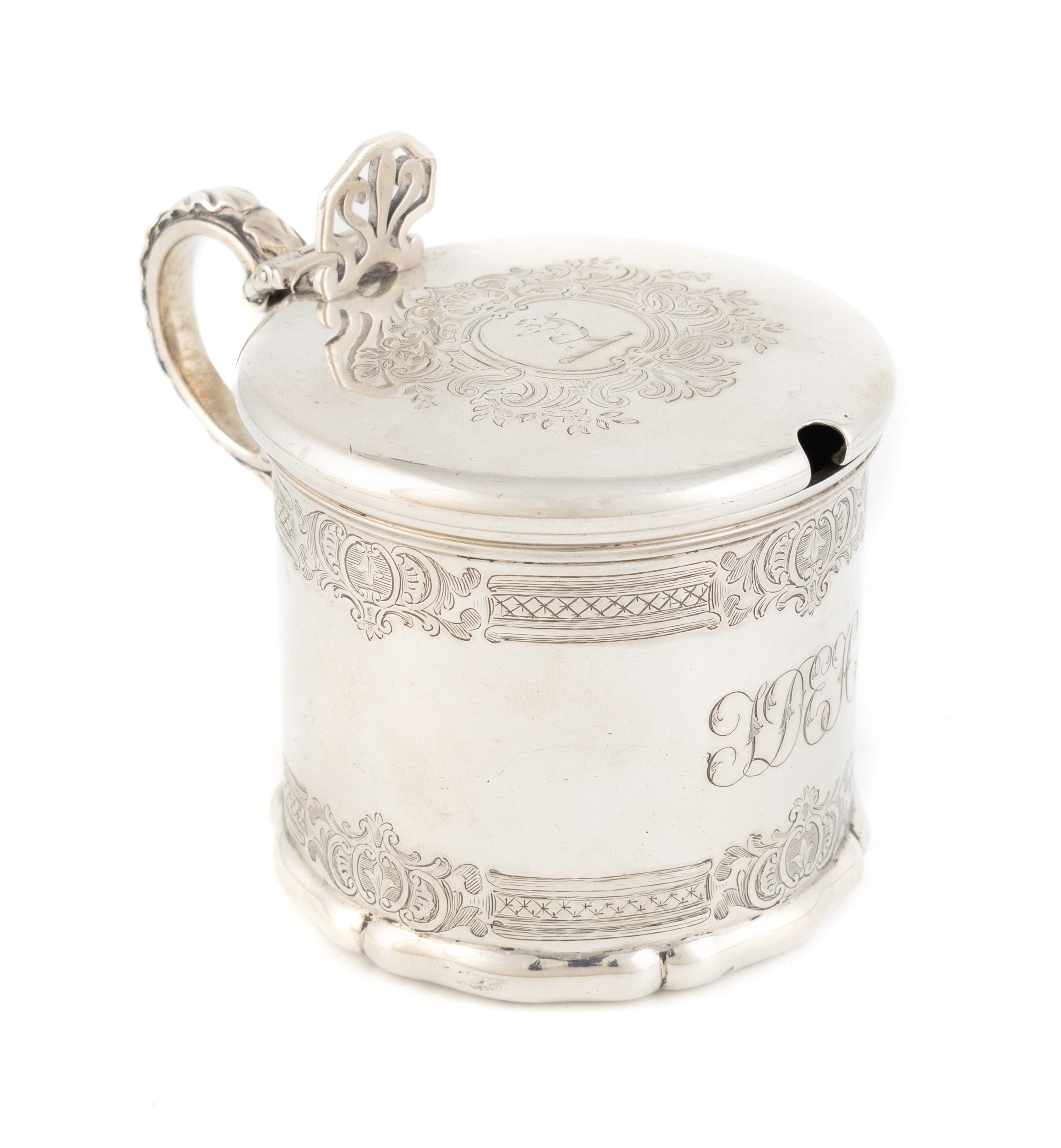 A Victorian silver mustard pot,by John Figg, London 1851,circular form, the sides with chased
