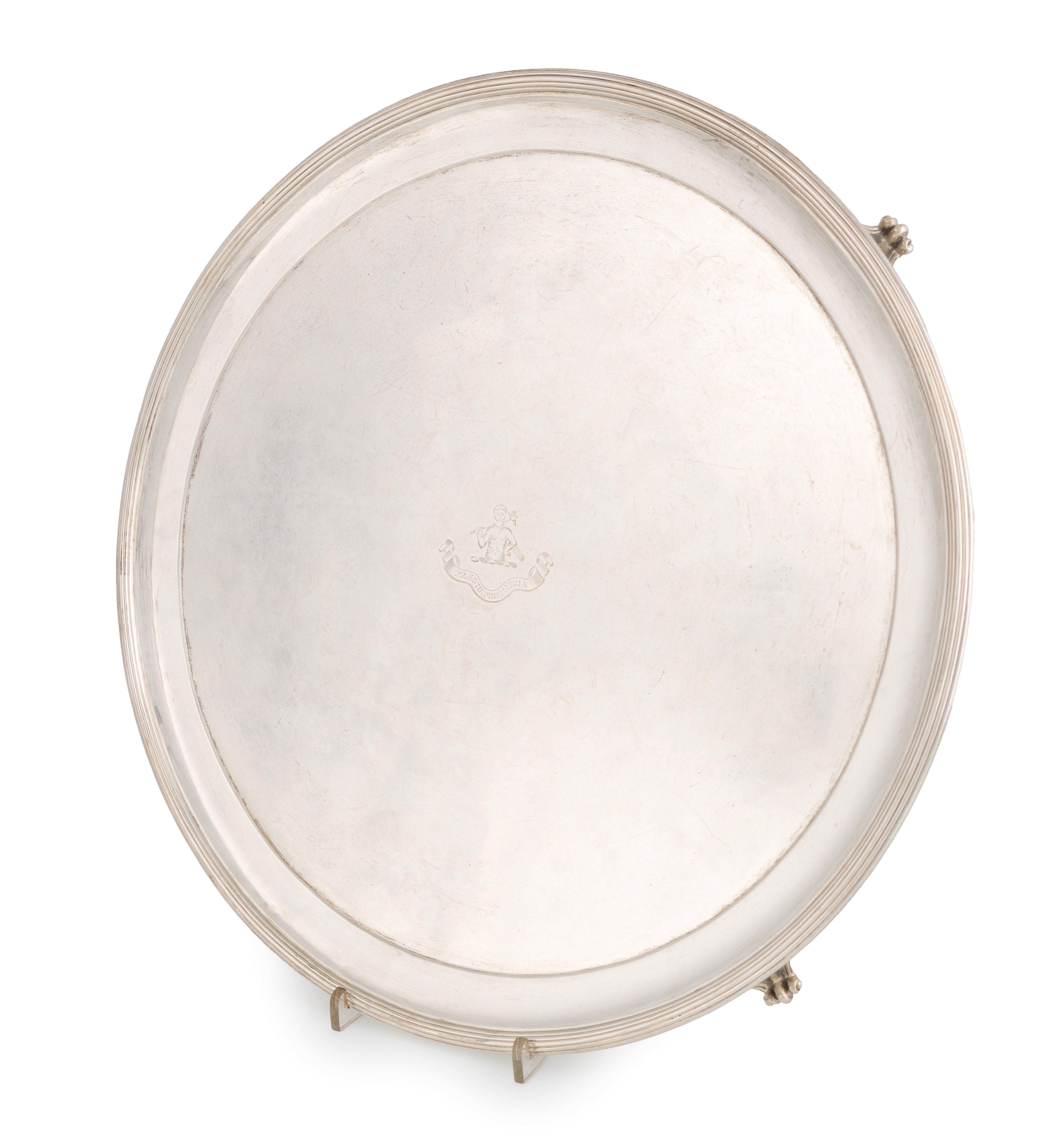 circular form with a reeded border, central engraved crest and motto, on four scroll bracket feet, diameter 40.8cm, approx. weight 55.3oz.