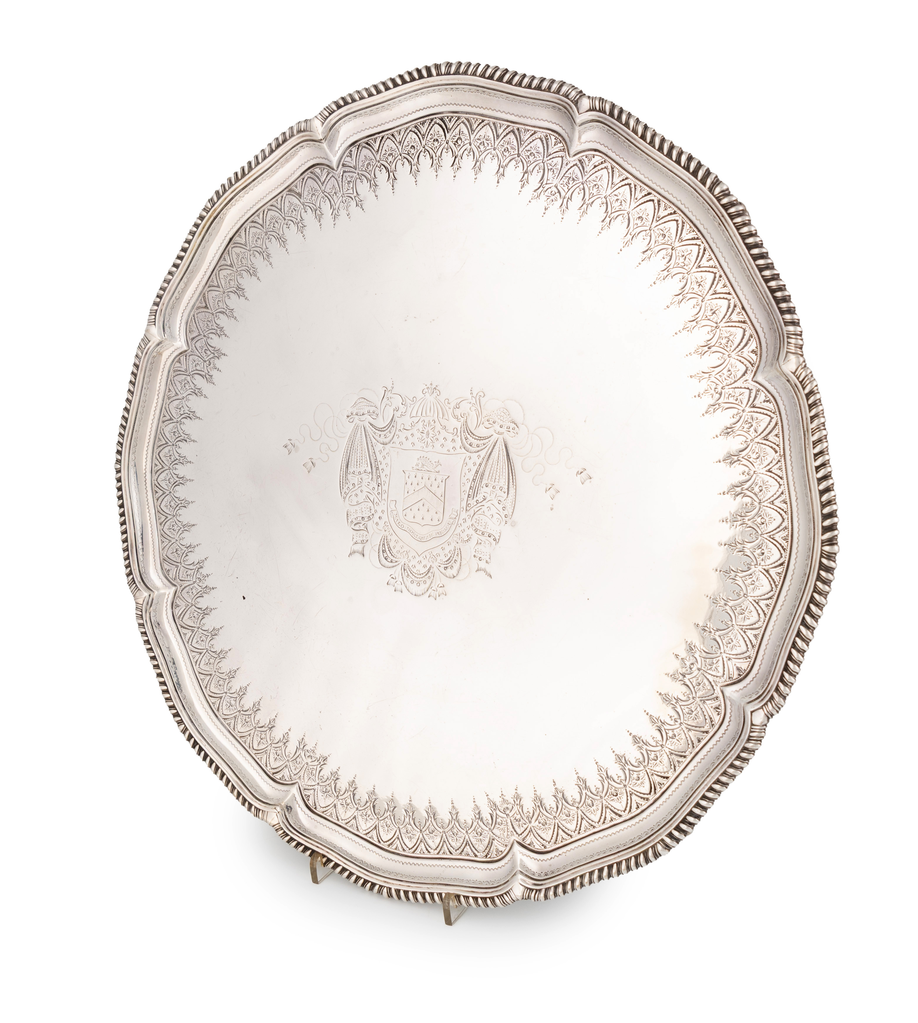 circular form with a moulded and gadrooned border, with a central engraved armorial and border, on four shell bracket feet, diameter 45.6cm, approx. weight 66.8oz.