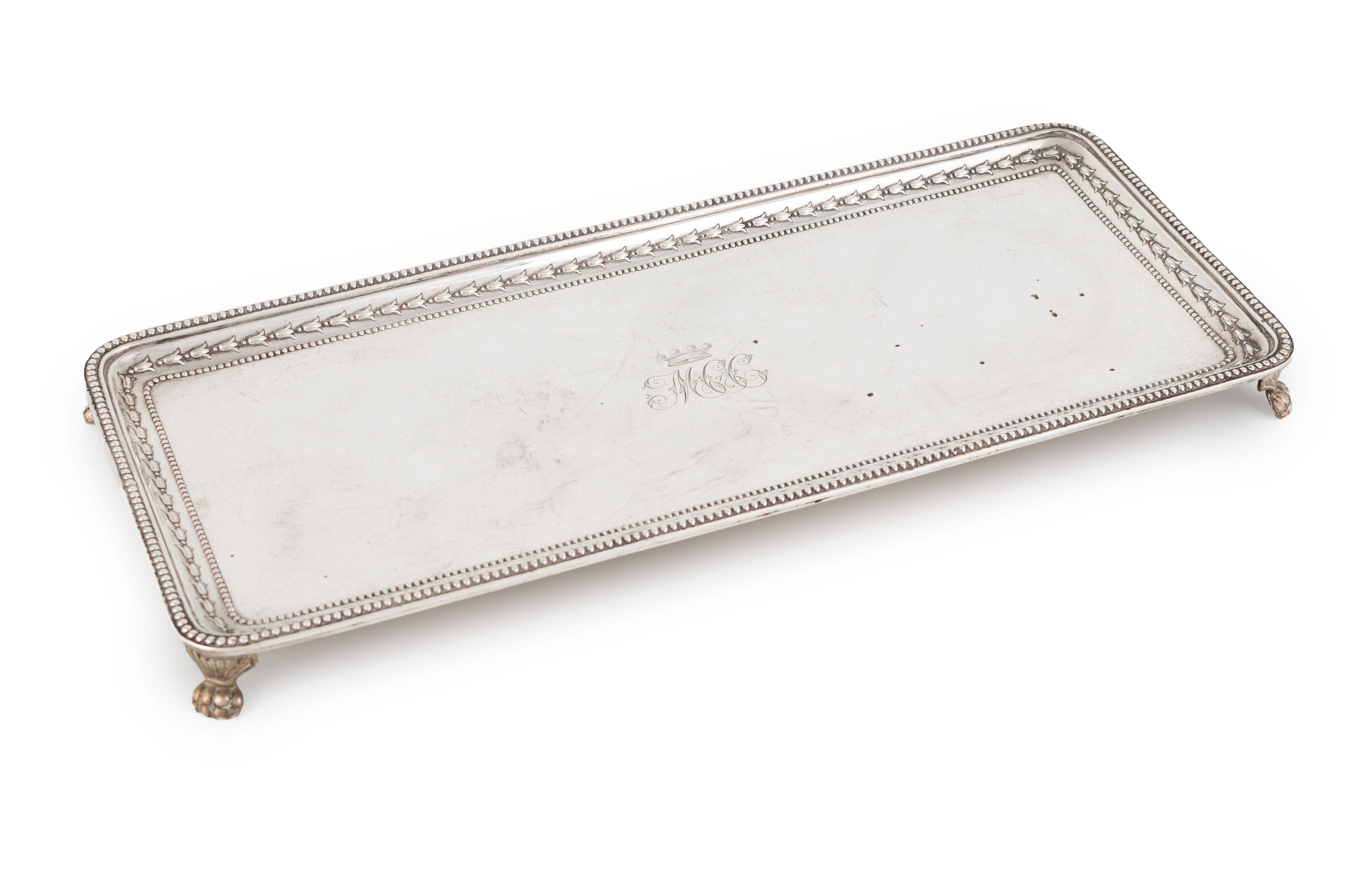 rectangular form with beaded and bud borders, central crowned initials, on four bracket paw feet, length 30.7cm, approx. weight 15.5oz.