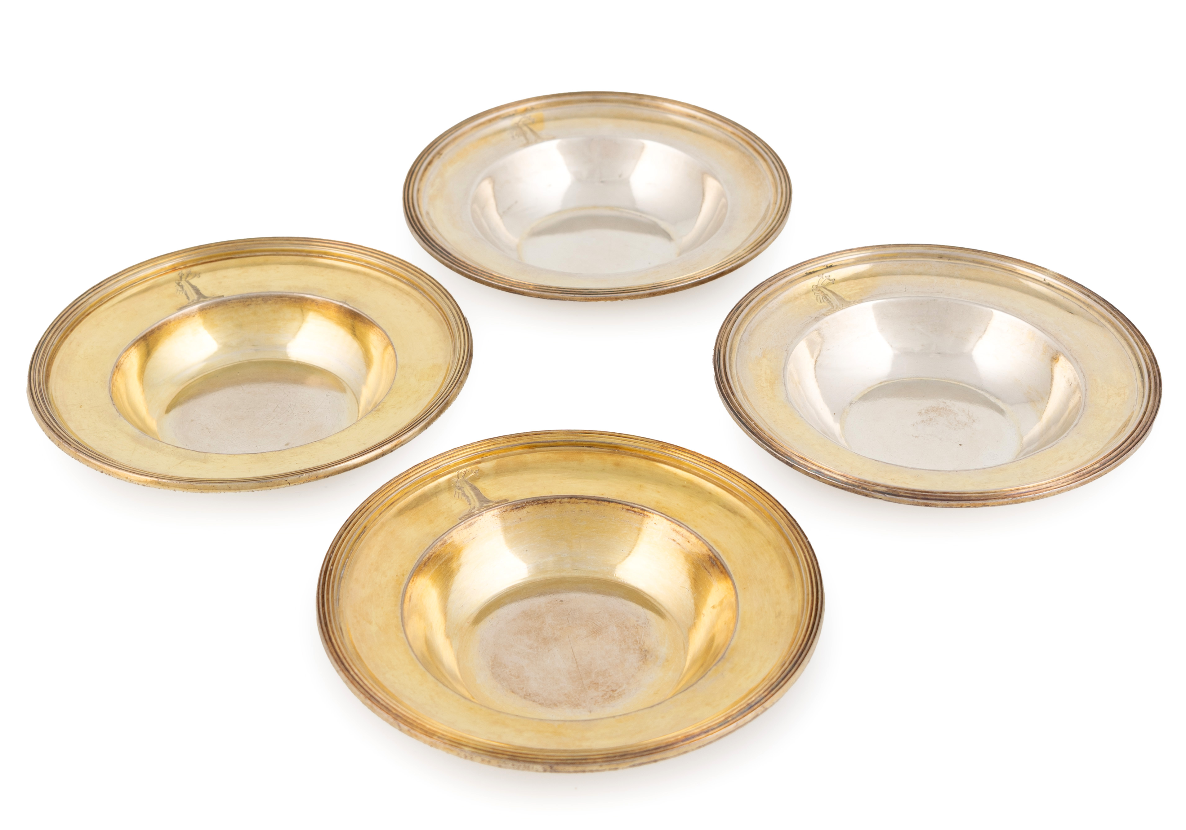 circular form with reeded borders, engraved crests, diameter 10.9cm, total approx. weight 10.7oz. (4)