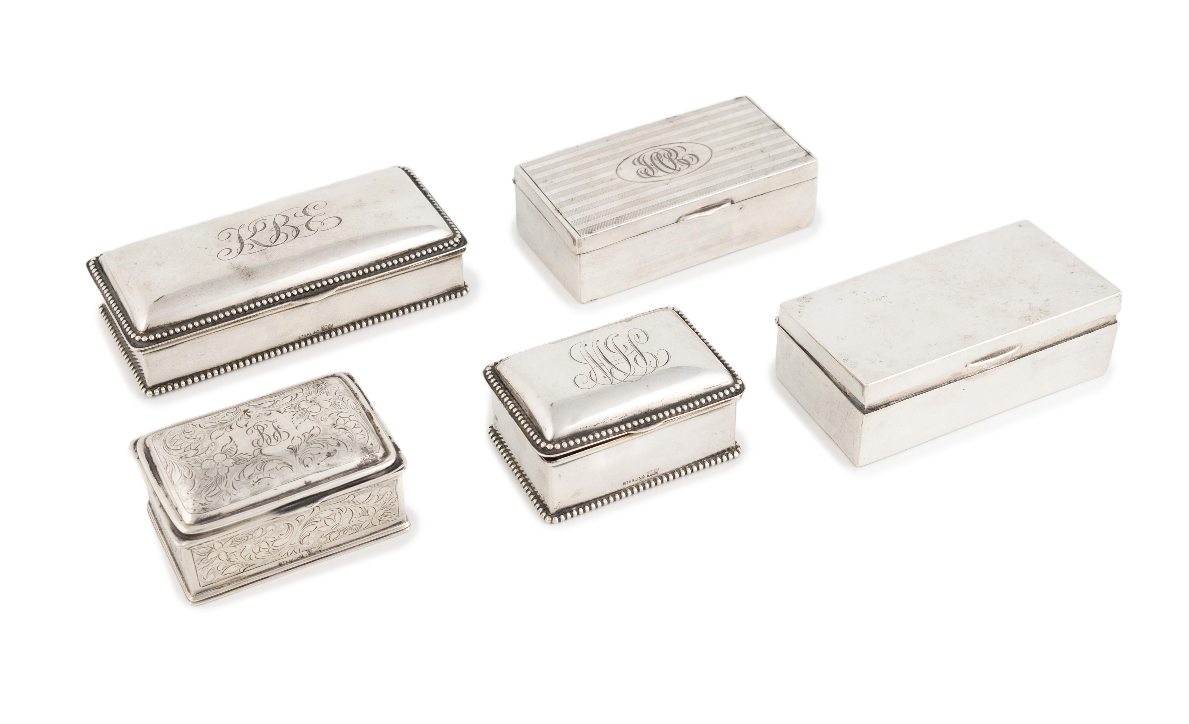 comprising: two by J.F. Fradley & Co., New York circa 1910, rectangular form, one cover with spot-hammered decoration, the other with engine-turned decoration with engraved initials, and three by Wilcox Silver Plate Co., Meriden circa 1900, rounded rectangular form, one with a beaded border, one with engraved foliate decoration and another larger one with a beaded border, total approx. weight 10.1oz. (5)