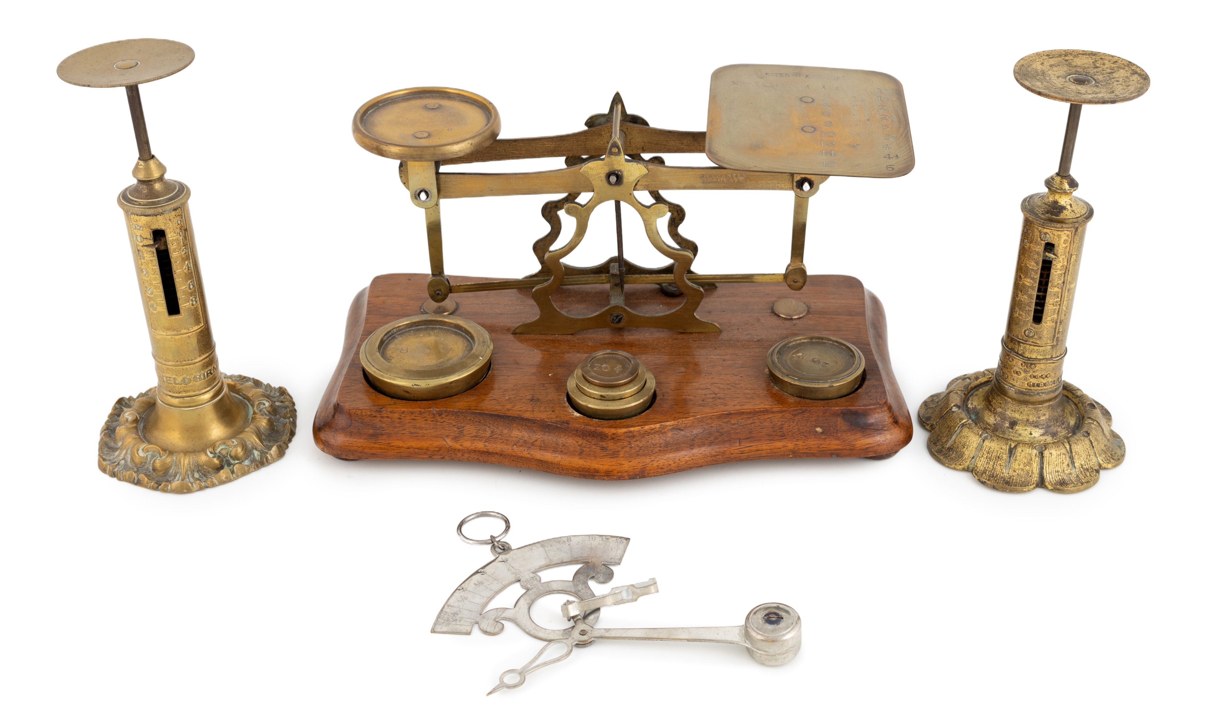 wirework scale frame, five weights, on a shaped rectangular form, plus two gilt metal Victorian letter scales by RW Winfield, candlestick form with shaped foliate and scroll bases, and an electroplated hook letter scale. (4)