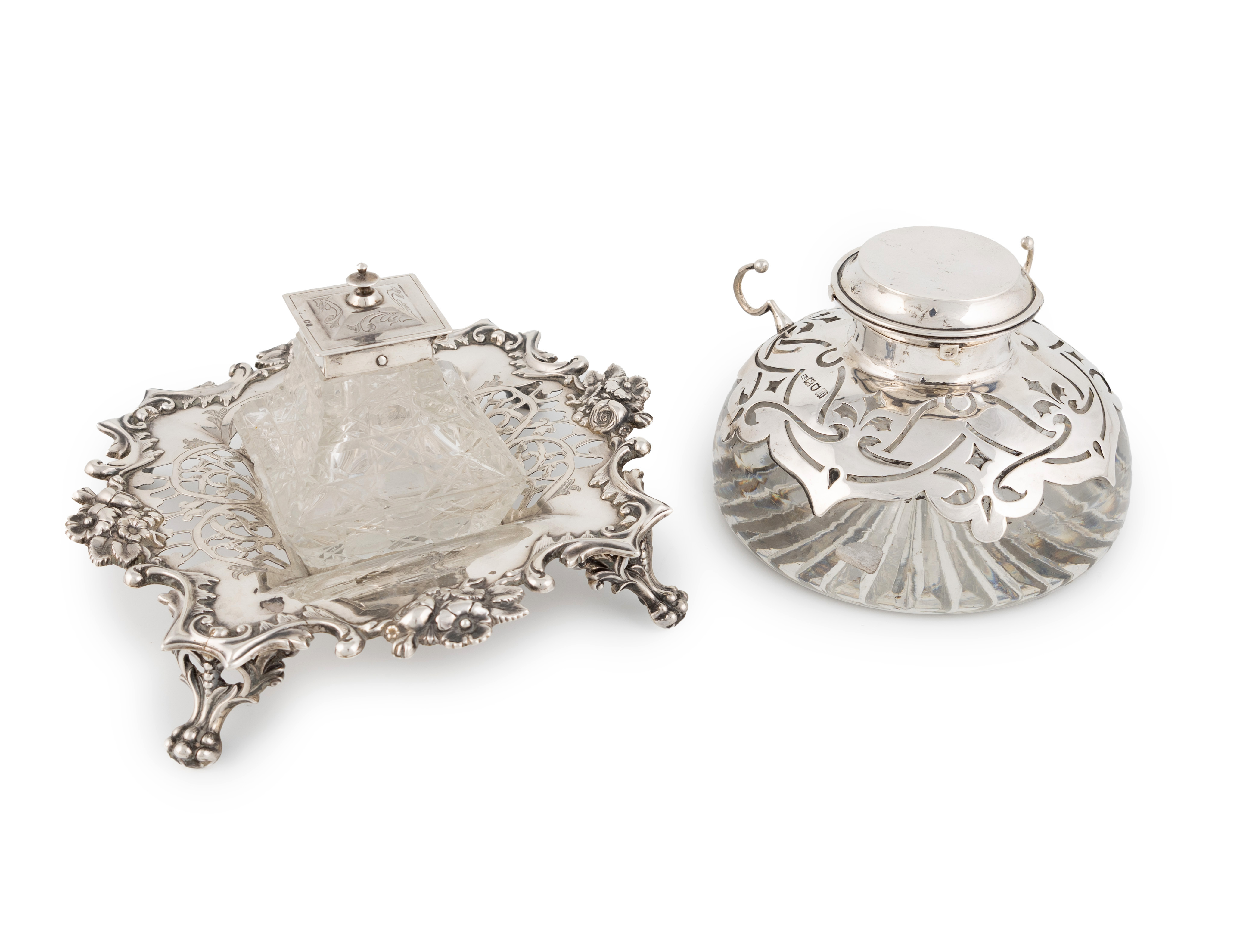 square-shaped with a scroll and foliate border, pierced scroll decoration, with a cut glass inkwell, on four claw and ball feet, plus a silver-mounted glass inkwell and stamp box by Samuel Jacob, London 1907, diameter 13.6cm, approx. weighable 6.8oz. (2)