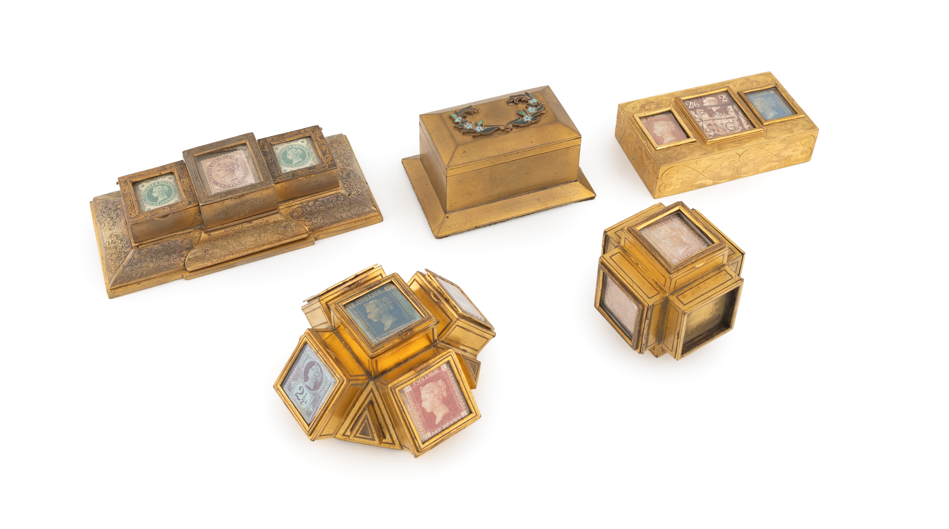 one rectangular form with engraved scroll decoration, one of raised rectangular form with enamel decoration to the cover, one of cube form, one of octagonal form and one of raised rectangular form with engraved foliate decoration. (5)