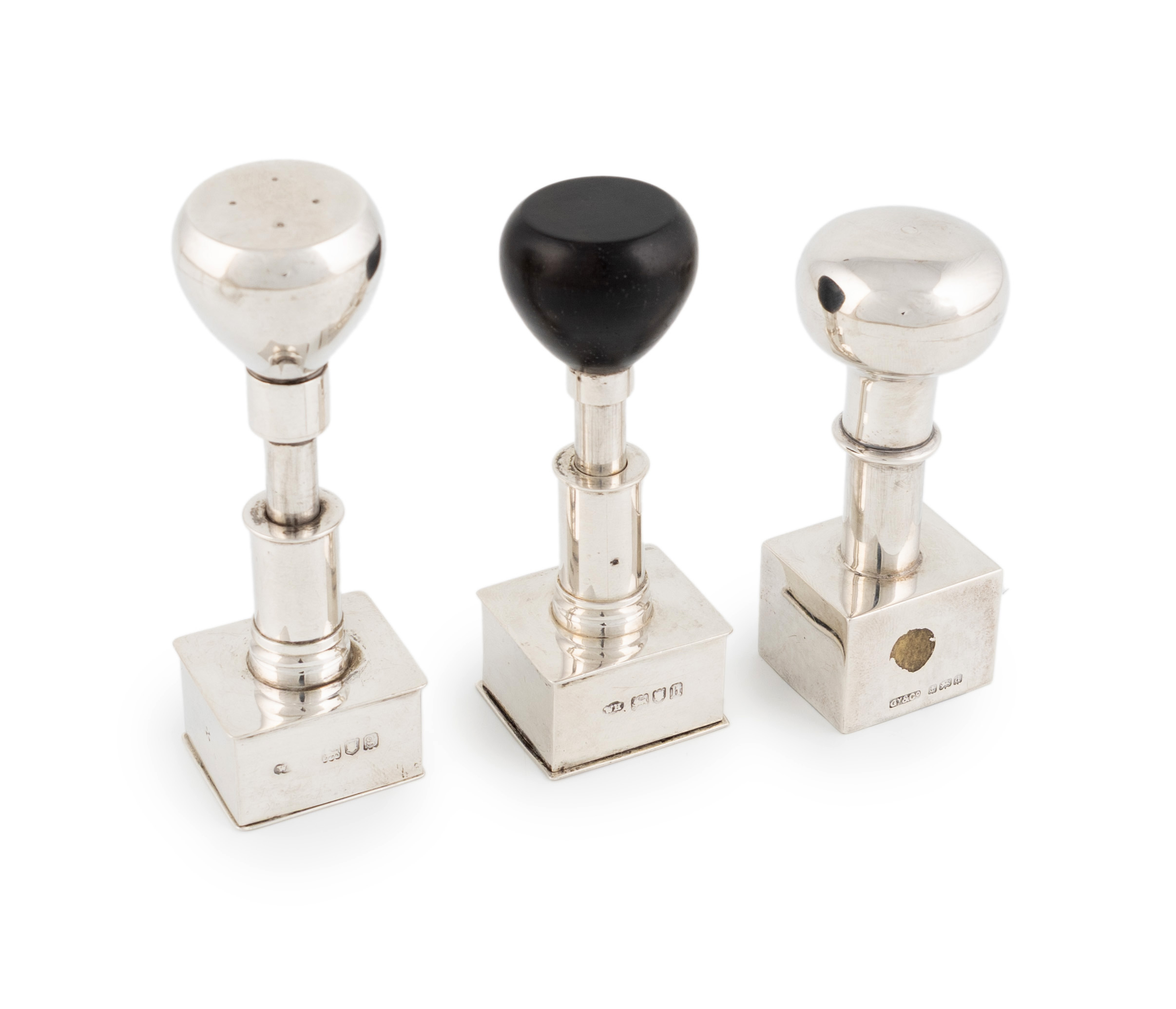 and one by Grey & Co., Birmingham 1903, of tapering circular form, one with a moistener on a cylindrical stem, push-action stamper in the rectangular base, height 8.6cm. (3)