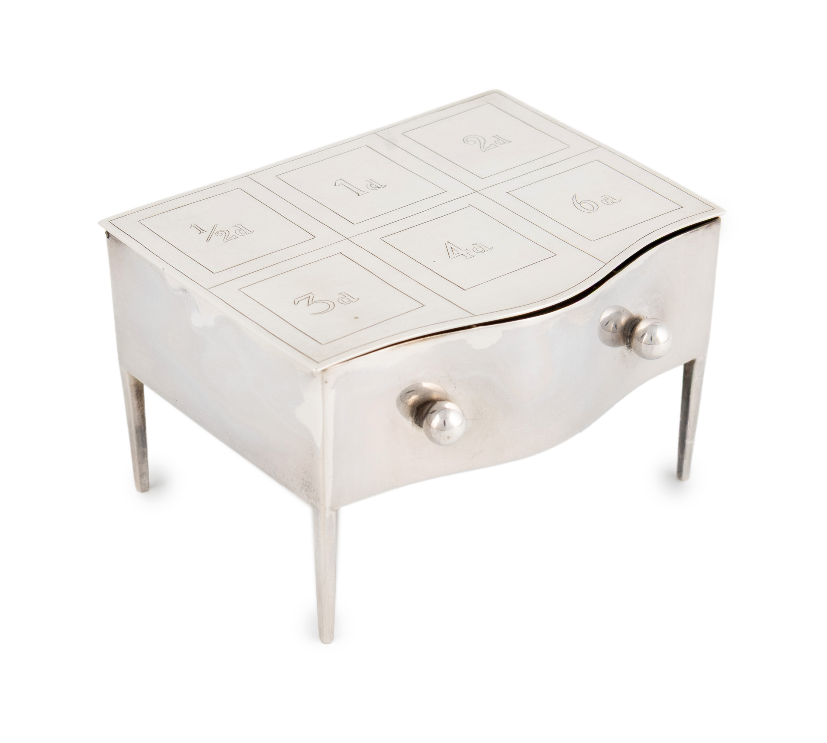 modelled as a lowboy, the cover engraved with stamp prices, the interior with six gilded stamp compartments, length 9.4cm, approx. weight 7oz.