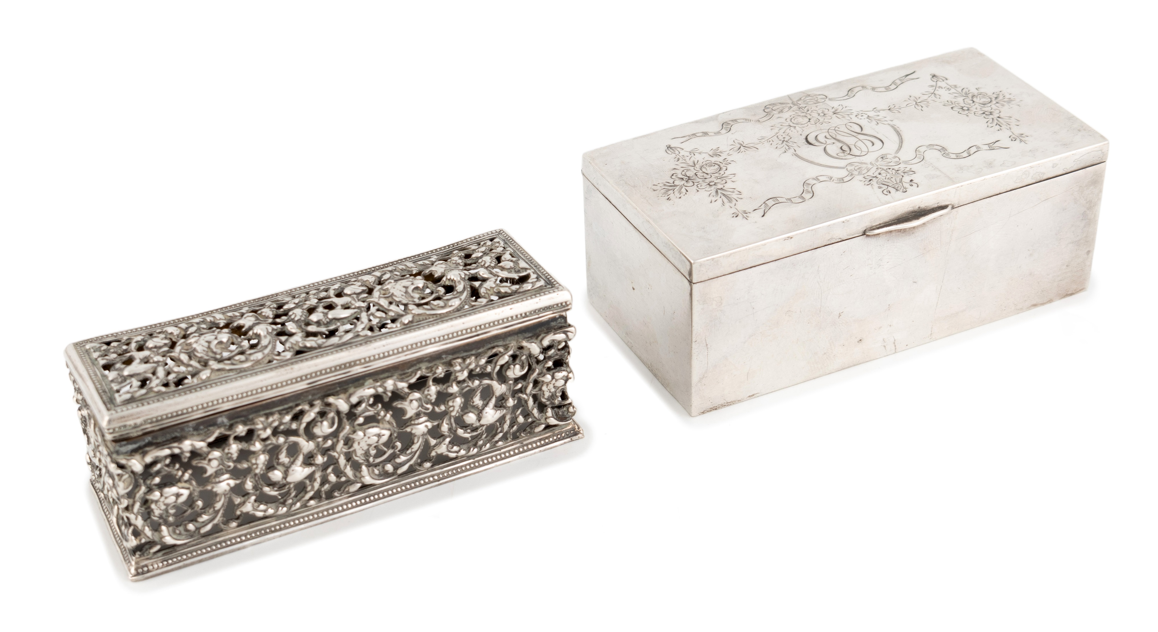 plain rectangular form with engraved foliate garlands, ribbons and initials to the cover, length 10.3cm, plus an American silver stamp box, marks are worn, pierced chased scroll foliate decoration, total approx. weight 8.1oz. (2)