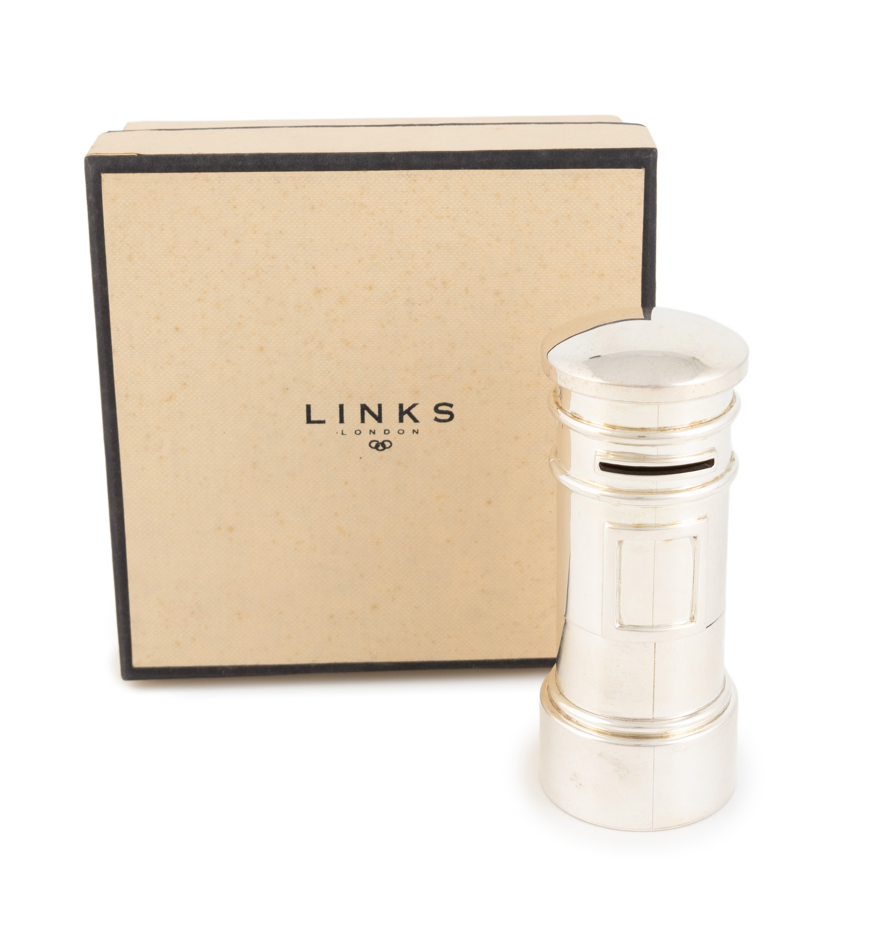 in the form of a pillar box, with a pull-off front, with a Links of London box, height 10cm, approx. weight 3.7oz.