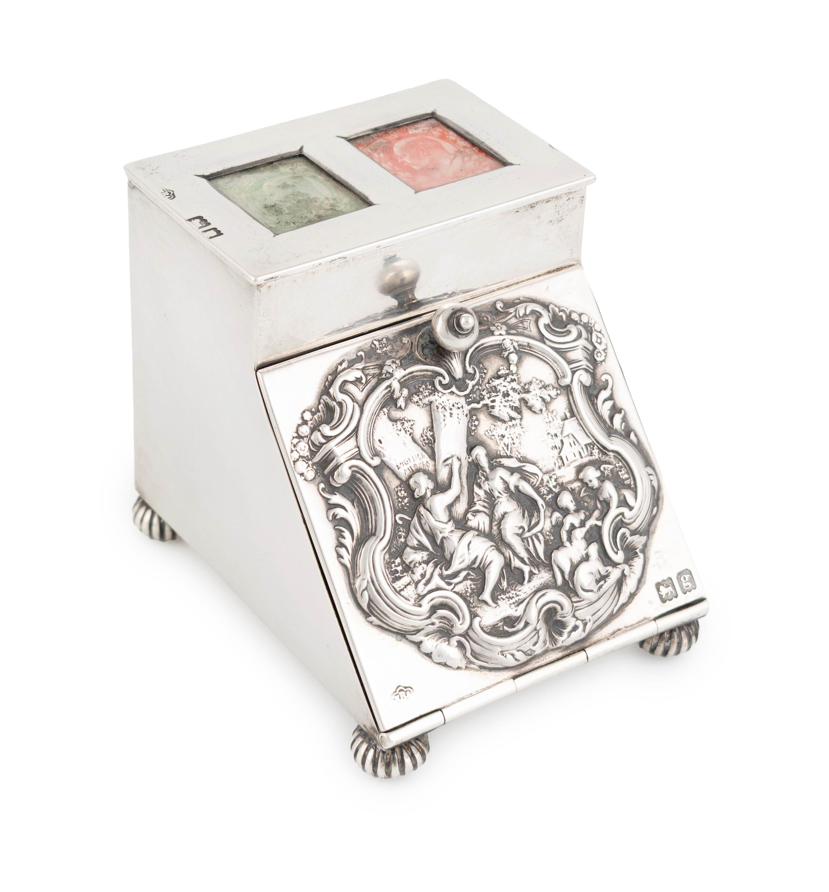 rectangular form, the hinged front with an embossed rural scene with figures by a tree, a hinged stamp compartment to the top, with a nib tray and brush to the interior, on four fluted bun feet, length 8.1cm.