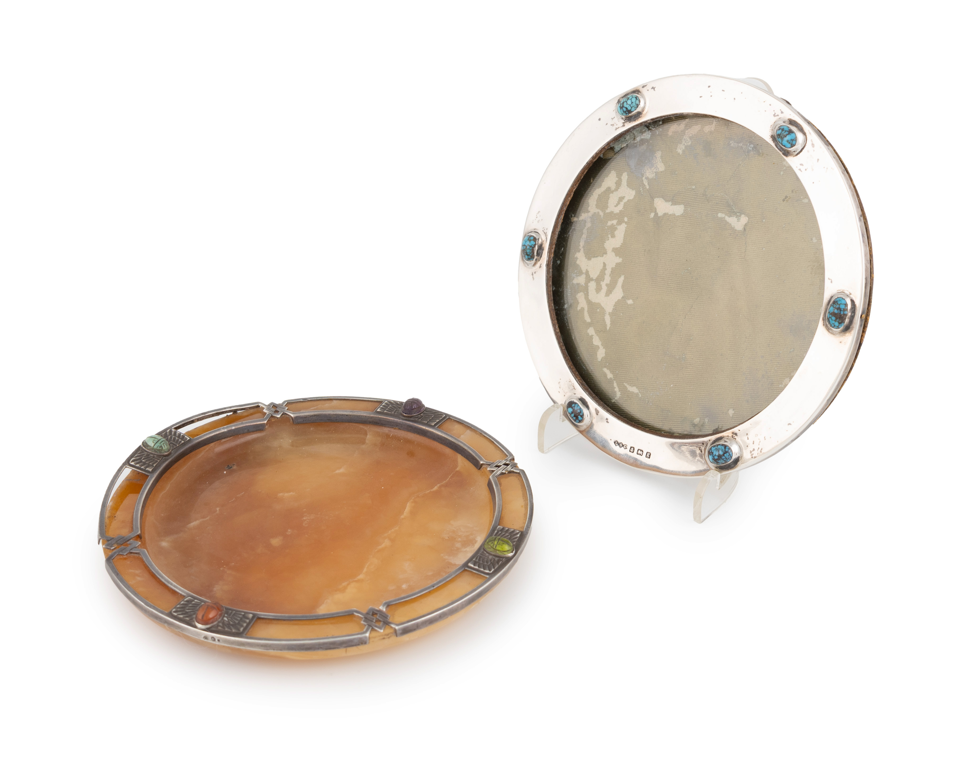 circular form set with turquoise cabochons, plus an early-20th century Austrian silver-mounted alabaster dish with Egyptian-style decoration (a.f), diameter 13.4cm. (2)