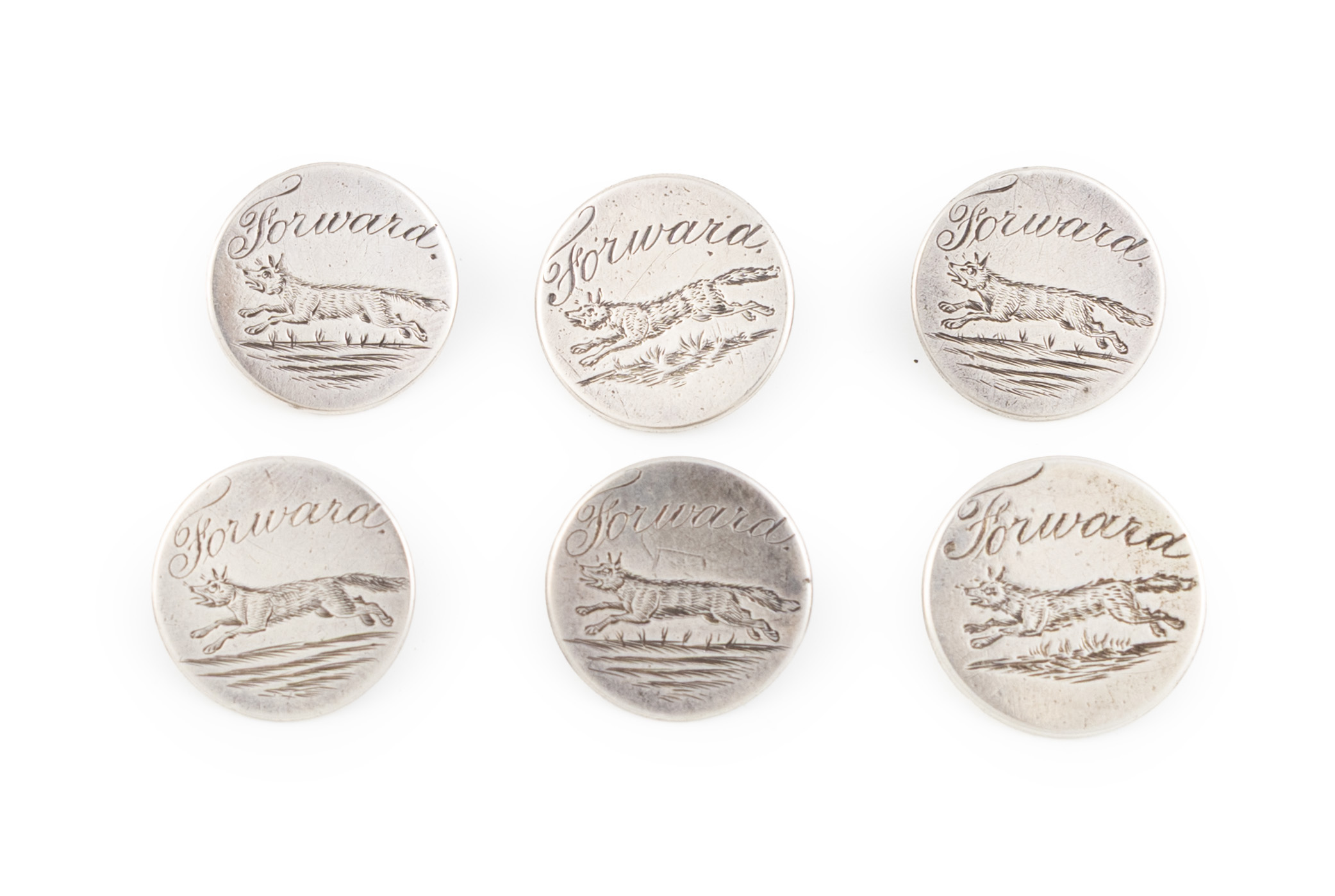 circular form, engraved with a running fox and 'Forward', diameter 2.2cm, approx. weight 1oz. (6)