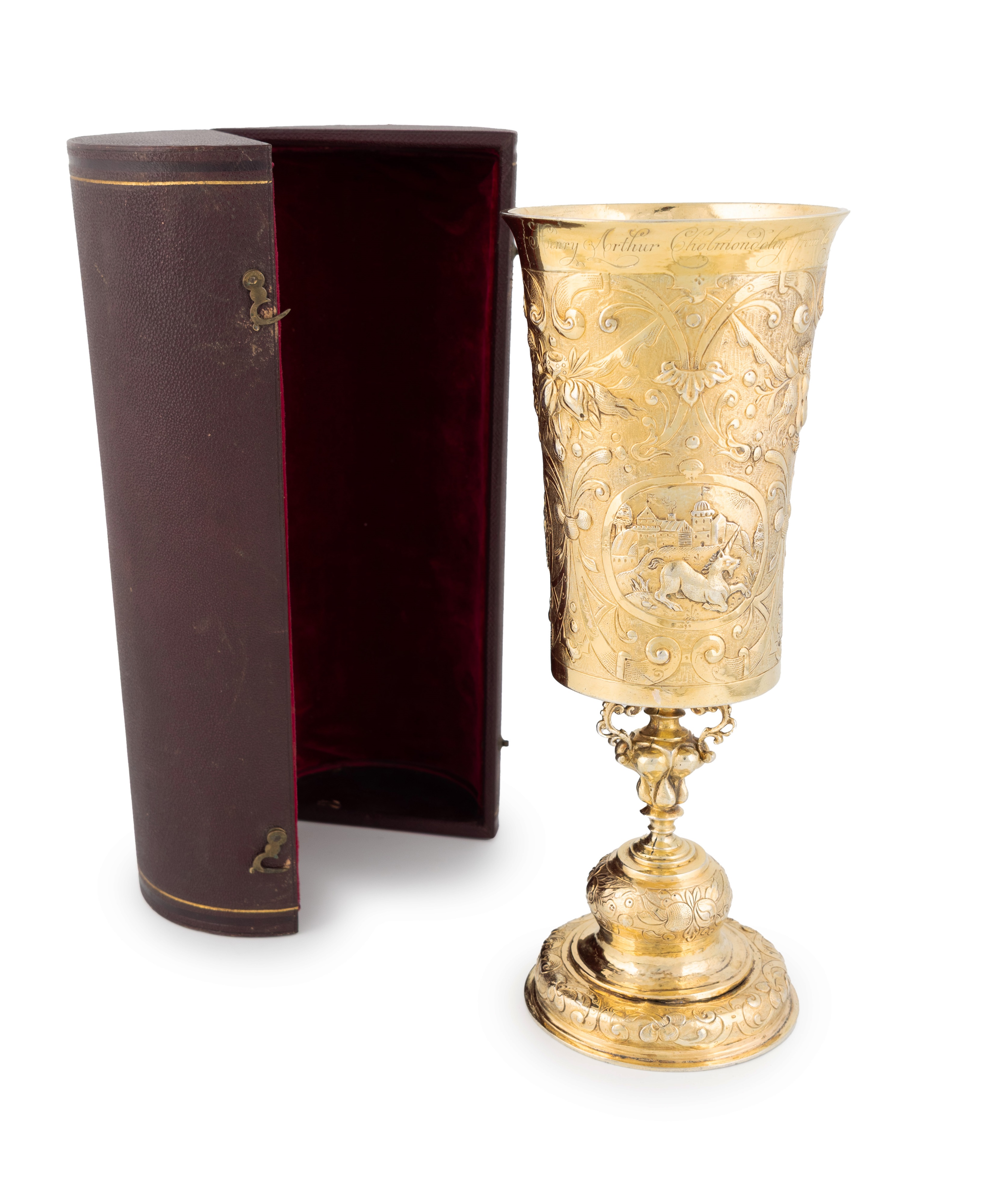 the slight tapering circular form, embossed with animals and a unicorn in landscape settings within foliate scroll decoration, on a matted background, on a knopped stem with scroll supports on a raised circular foot, inscribed 'Henry Arthur Cholmondeley from his Godfather Watkin Williams Wynn 1851', in a fitted case, height 26.1cm, approx. weight 13.5oz.