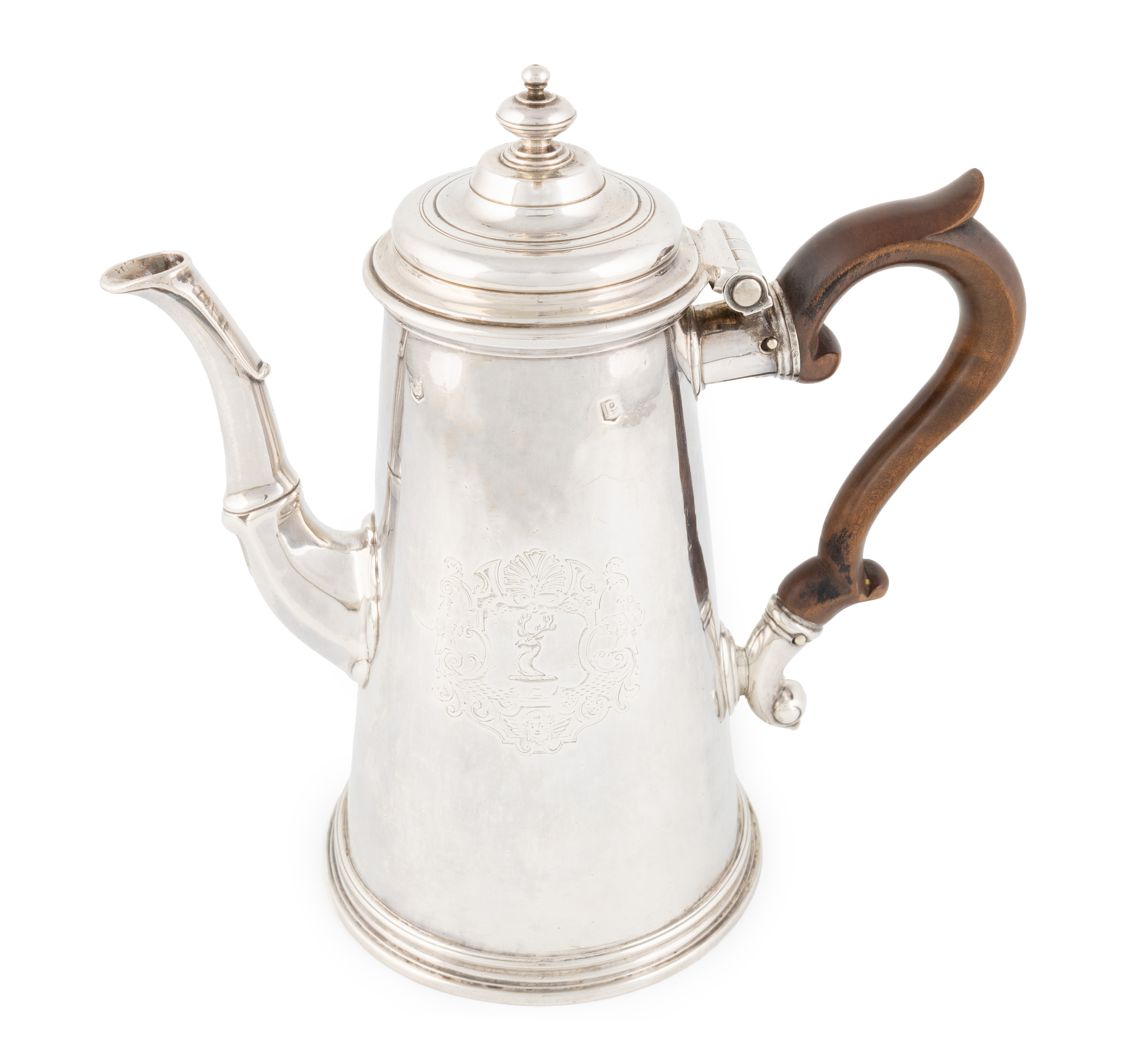 tapering circular form, faceted spout, wooden scroll handle, slightly raised cover with a knop finial, engraved with a crest within foliate scroll mantling, height 21cm, approx. weight 23oz.