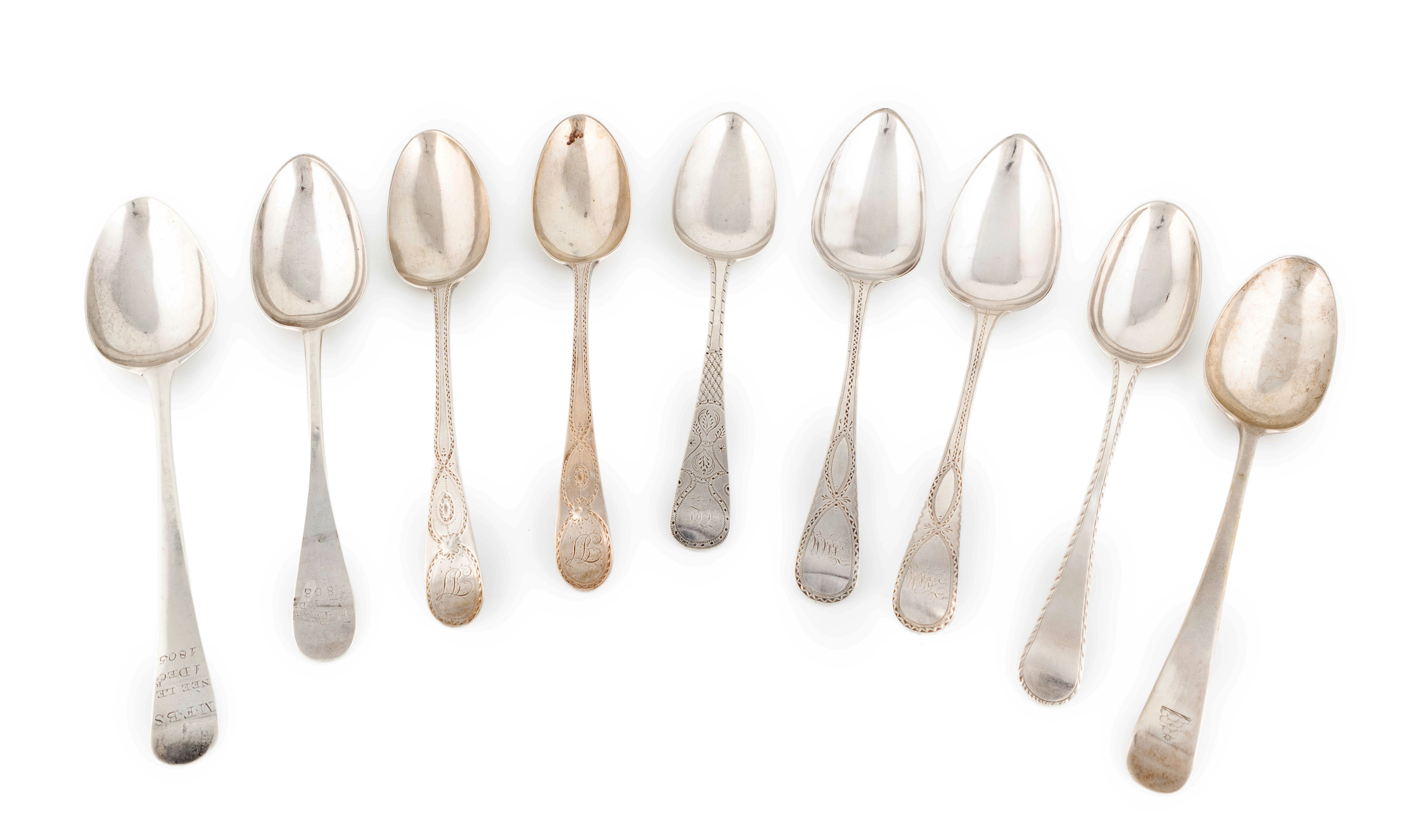A collection of antique silver Old English and Bright-cut tablespoons,comprising: five Channel