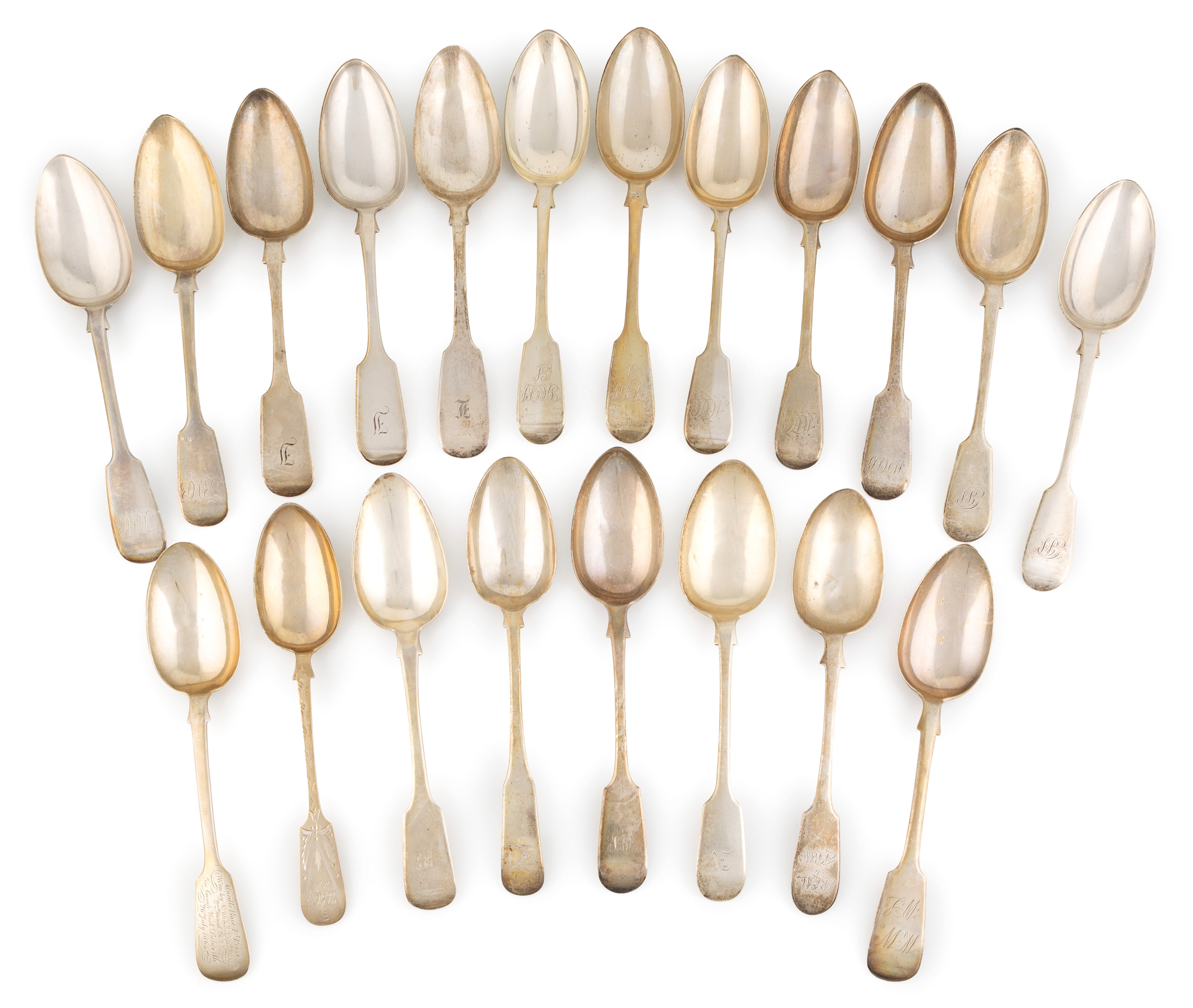 A collection of twenty George III-Victorian West Country silver Fiddle pattern tablespoons,Exeter,
