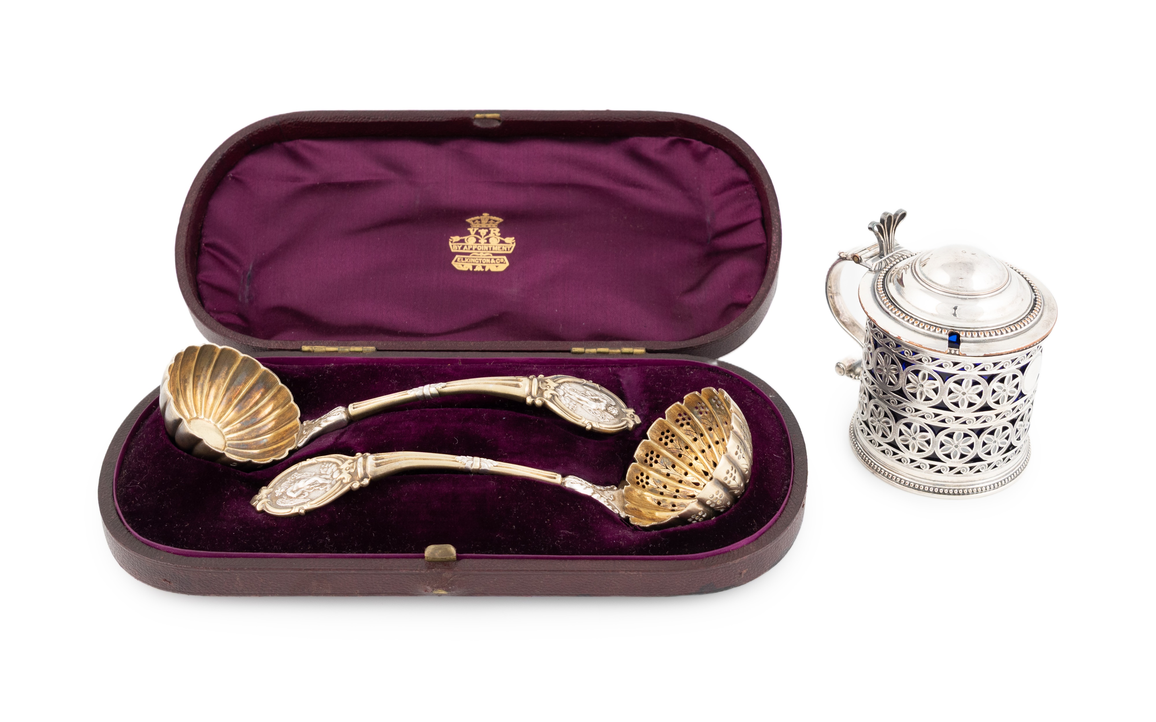 fluted bowls, the terminals with cherubs, in a fitted case, plus an Old Sheffield plated mustard pot, pierced decoration, beaded borders (2)