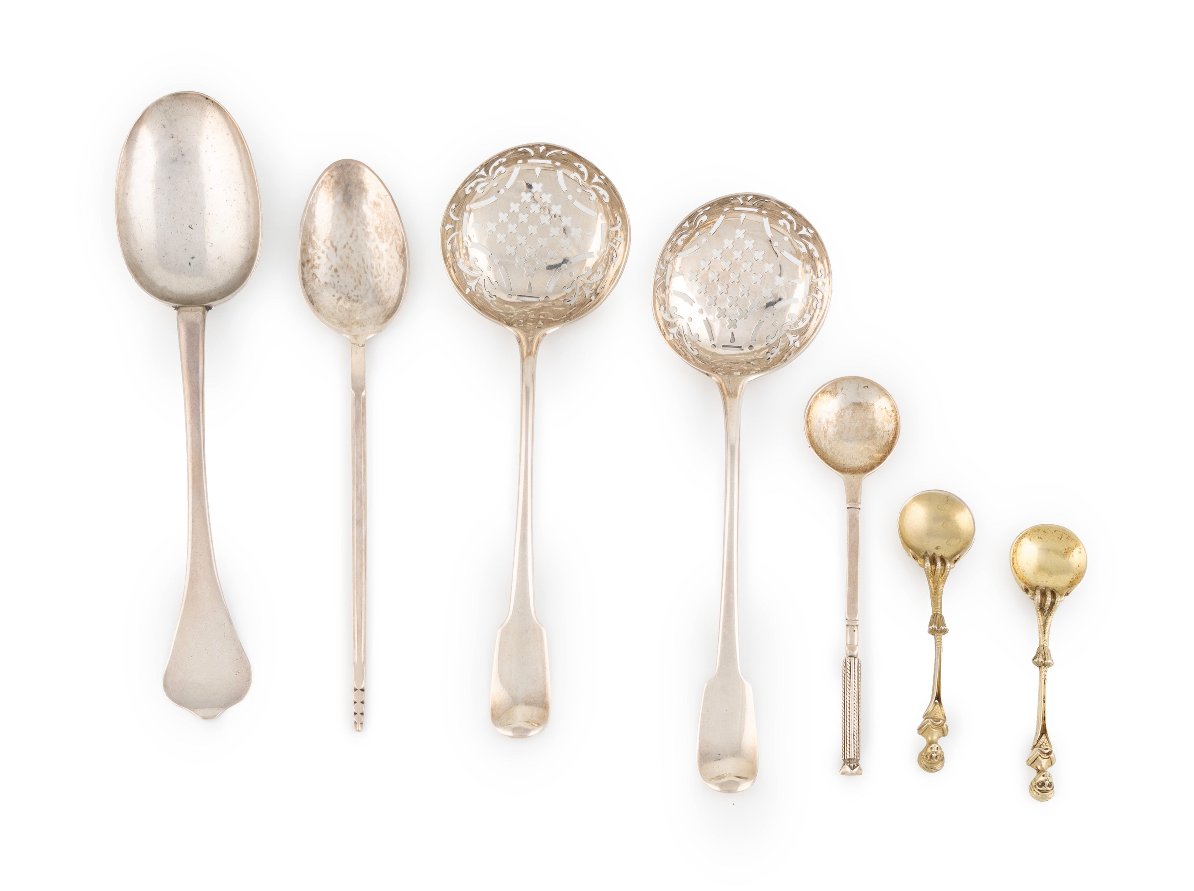 comprising: an 18th century Dog-nose spoon, marked with a fleurs-de-lys and maker's mark twice 'I*I', plus a pair of sifting spoons, a pair of continental silver-gilt salt spoons, and two Arts and Crafts spoons, approx. weight 7.9oz. (7)