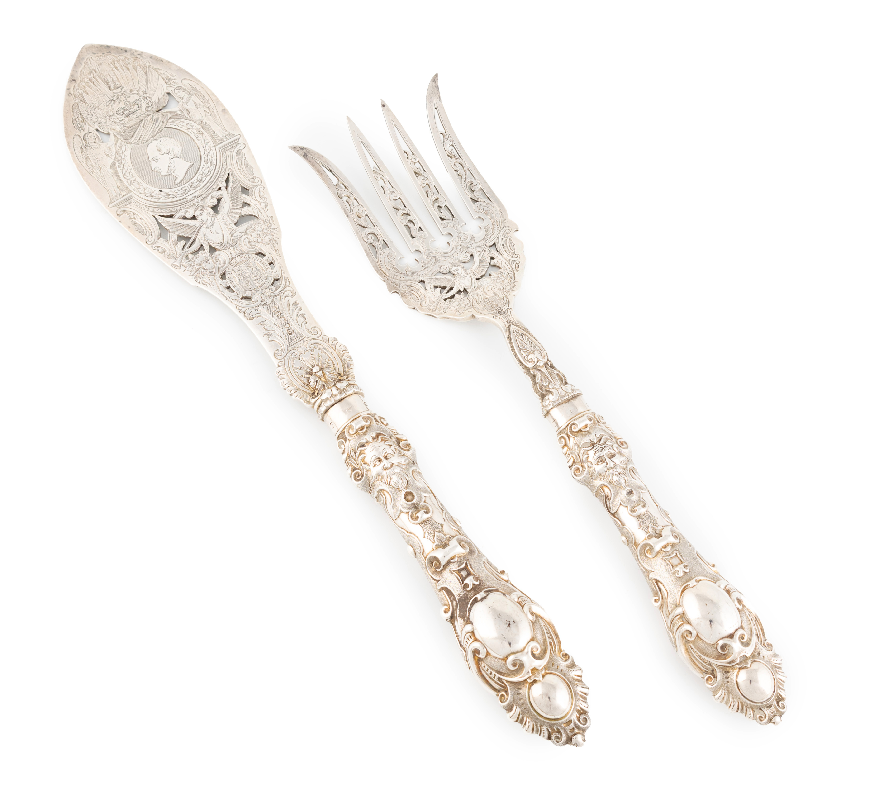 A pair of Victorian Prince Albert Memorial silver fish servers,by Martin, Hall and Co., Sheffield