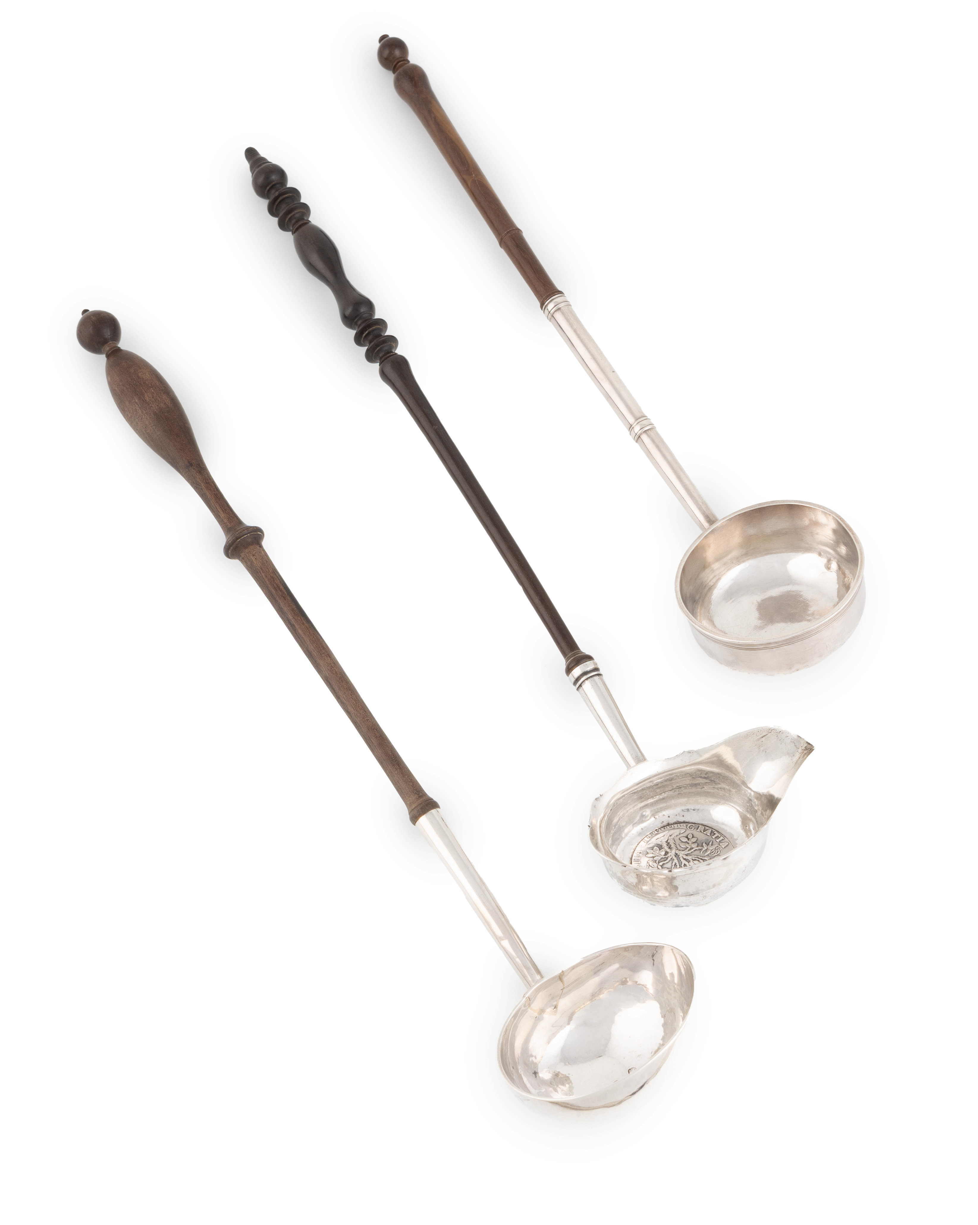 comprising: one with a deep circular bowl, maker's mark of PB and also marked 'sta', possibly Chester, turned wooden baluster handle, plus one with an oval bowl, marks worn, and an Irish one, by William Townend, Dublin circa 1740, oval bowl, set with an earlier coin, turned wooden baluster handle, length of longest 39cm. (3)