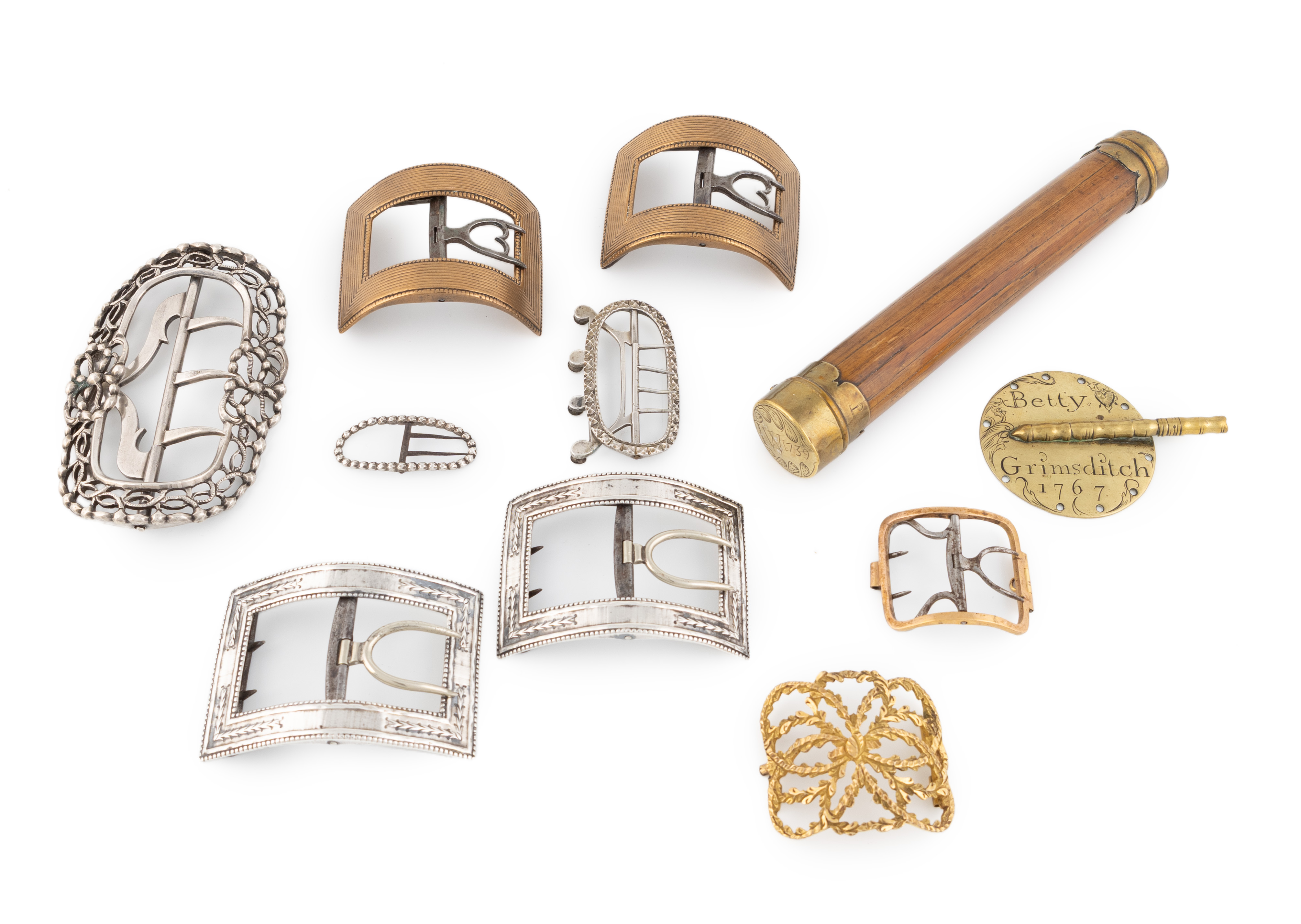 comprising silver items: a pair of George III shoe buckles by Simeon Coley I, London circa 1780, rectangular form, a Dutch buckle by Jan Glasouw, Amsterdam circa 1780, plus two other buckles and two gilt-metal buckles, plus a brass plaque inscribed 'Betty Grimsditch 1767', and a brass-mounted wooden tipsatff/container, the hinged cover engraved 'I.W 1739', the base scratch initialled 'T.L', approx. weighable 5.5oz. (11)