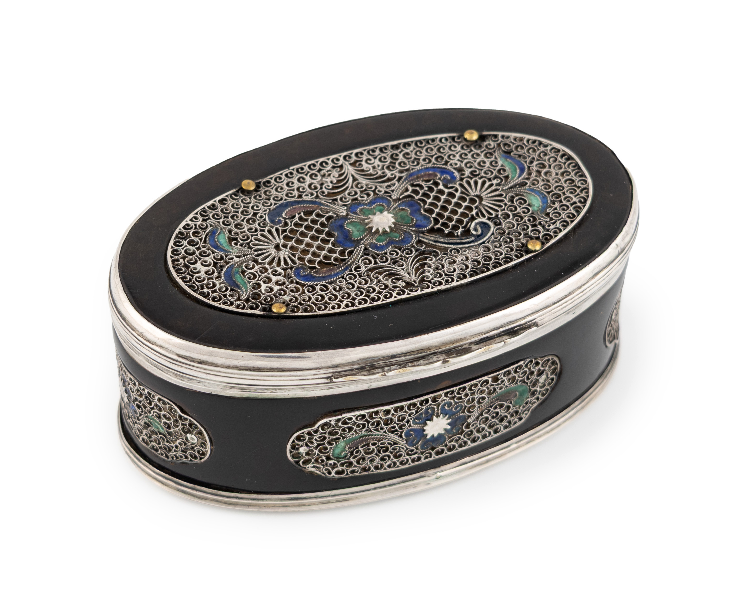λ A late-18th/early-19th century silver and enamel mounted tortoiseshell snuff box,unmarked circa