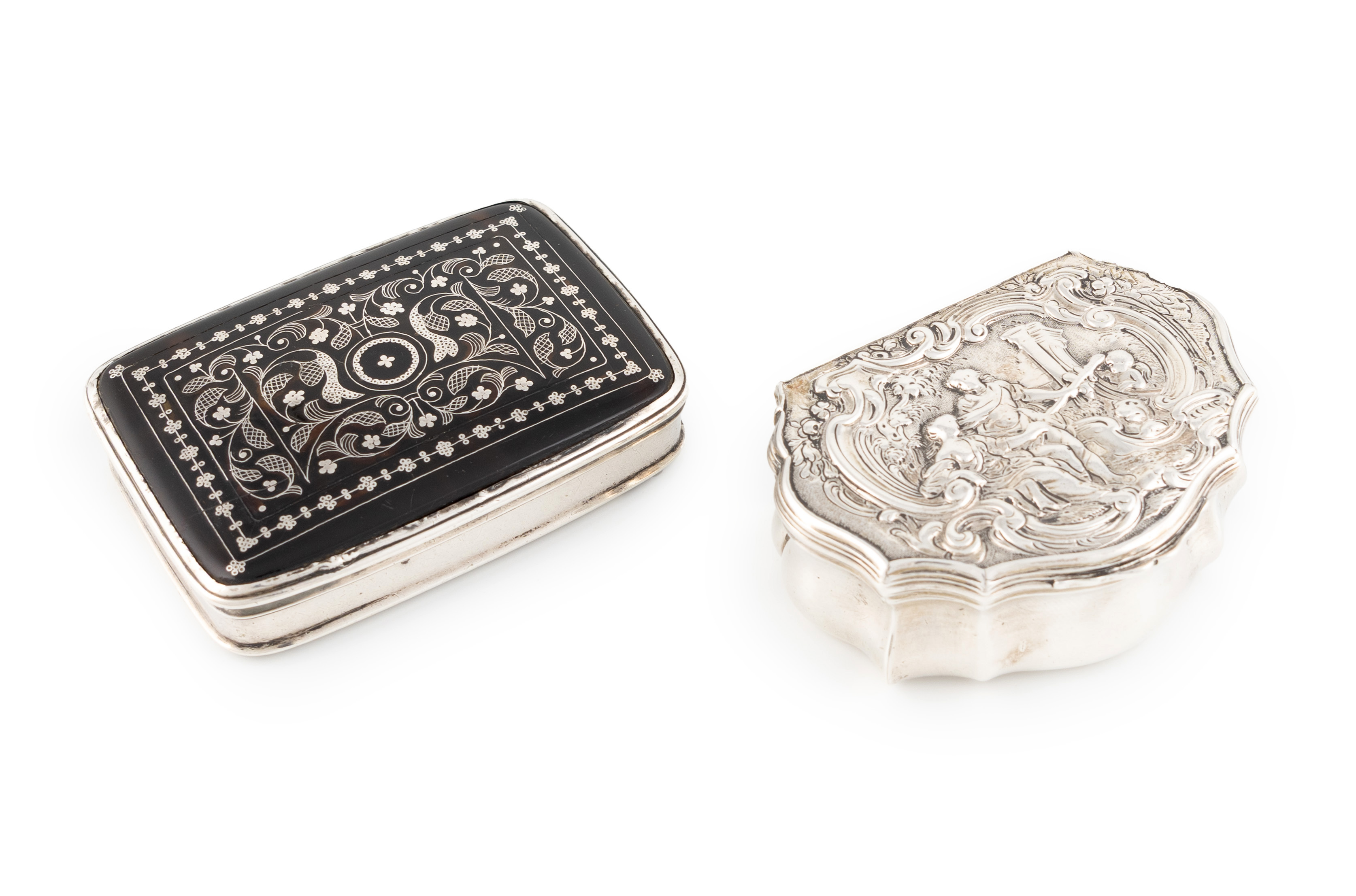 shaped rectangular bombé form, the hinged cover embossed with a figural scene in a classical landscape, the interior gilded, length 7.4cm, plus an 18th century silver and tortoiseshell snuff box, the hinged cover with inlaid wirework decoration, length 8cm, approx. weighable 2.7oz. (2)